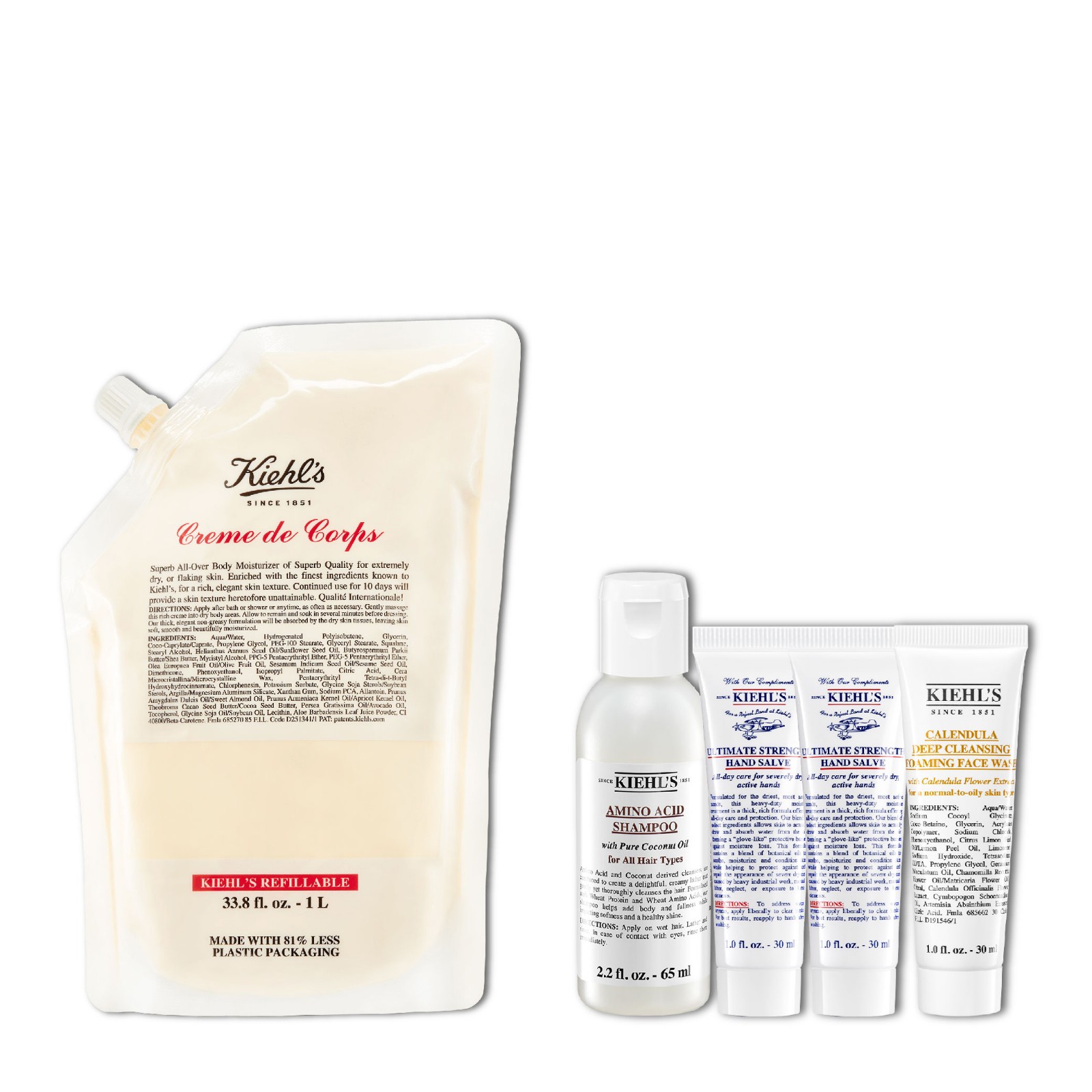 經(jīng)典潤膚乳 (補(bǔ)充裝) 套裝,HK$860 (價(jià)值:HK$1,065)。包括經(jīng)典潤膚乳補(bǔ)充裝1L,氨基酸洗髮水 65ml,2支高效能潤手霜30ml,金盞花深層潔面泡沫30ml。