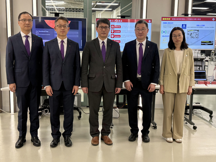 圖為理大副校長(研究及創(chuàng)新)趙汝恒(中)、醫(yī)療科技及資訊學(xué)系系主任兼教授蔡璟(左二)、眼科視光學(xué)院科研眼科講座教授何明光(右二)、機(jī)械工程學(xué)系智能機(jī)器人與自動(dòng)化講座教授張丹(左一)及電機(jī)及電子工程學(xué)系博士後研究員崔靜嫻合照(右一)。