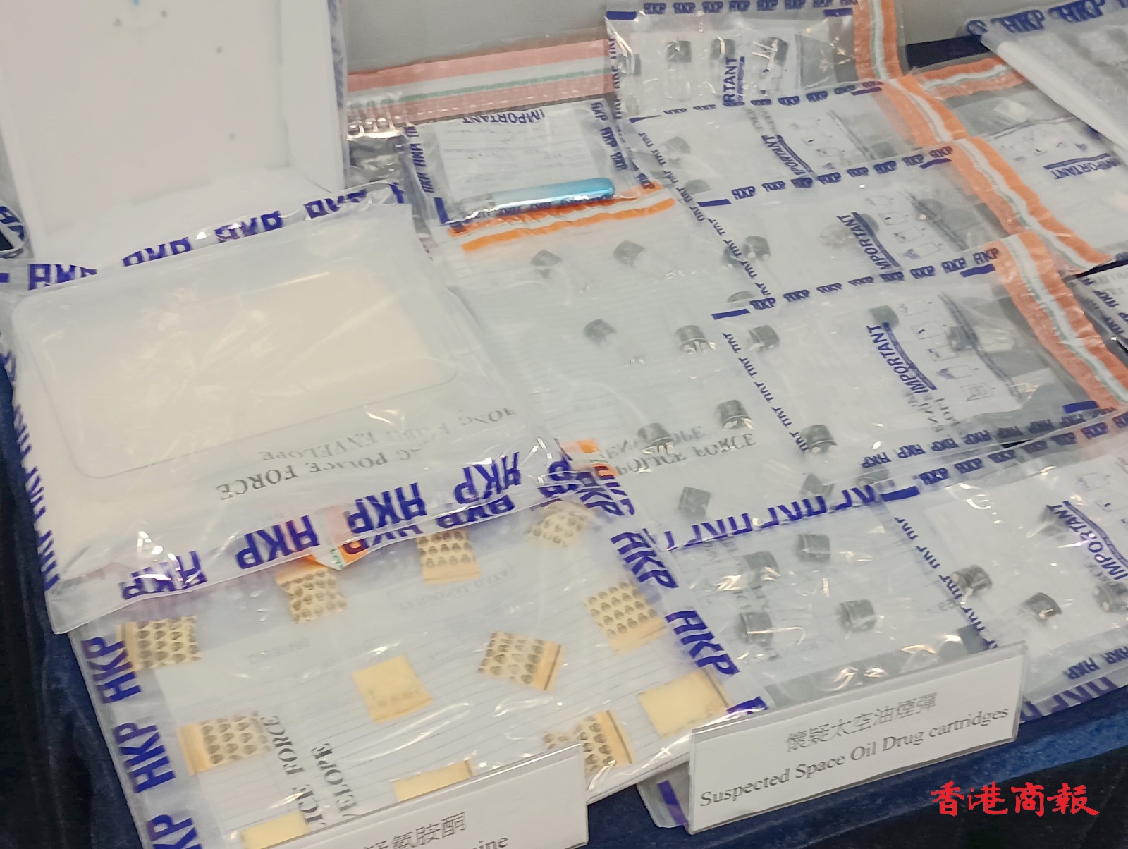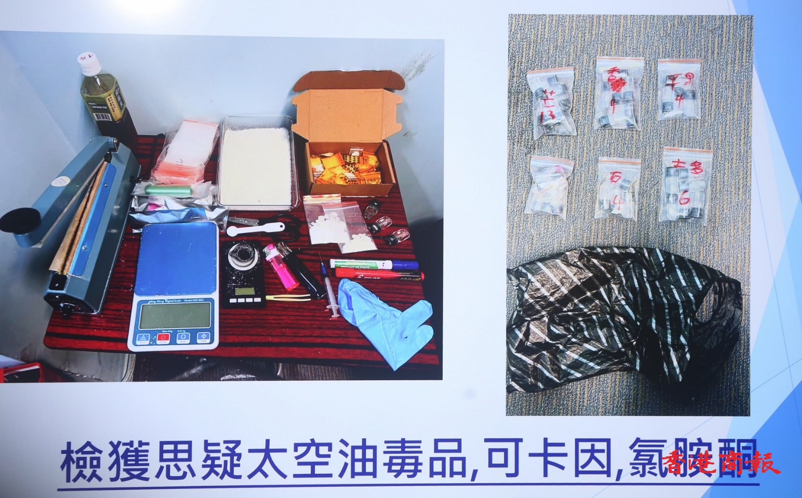 何灝庭介紹,檢獲的毒品包括約51公斤懷疑可卡因、1公斤懷疑冰毒、81公斤懷疑氯胺酮、33公斤懷疑海洛英、669棵大麻植物,約12公斤大麻、889支大麻油、1.1公升液態(tài)依托咪酯、1公斤依托咪酯粉末和2490粒太空遊毒品煙彈,檢獲的液態(tài)和粉末估計(jì)可製造1.2萬枚煙彈。