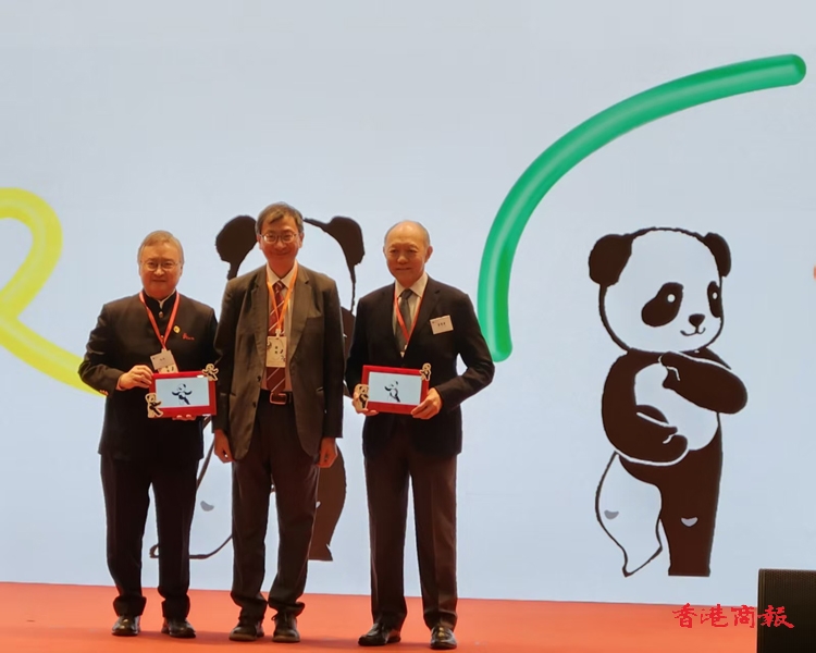 教大校長李子建(中)致送紀念品予陸地(左)及霍震寰(右)。