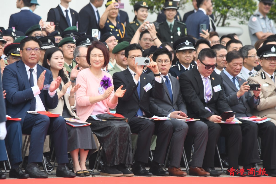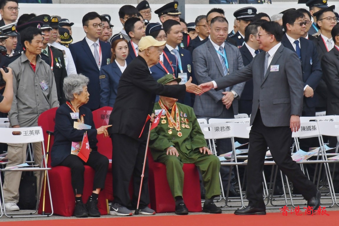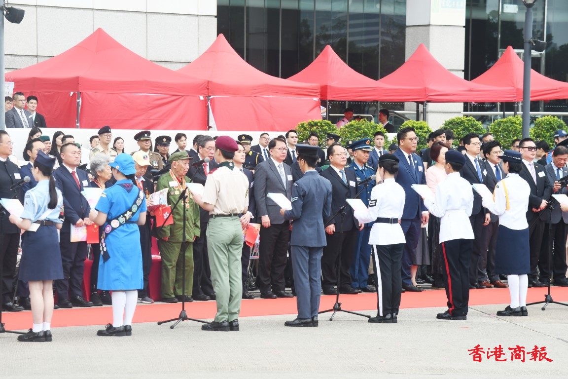 政務(wù)司司長(zhǎng)陳國(guó)基、民政及青年事務(wù)局副局長(zhǎng)梁宏正、中聯(lián)辦副主任劉光源、外交部駐港特派員公署副特派員潘雲(yún)東、前特首梁振英與太太梁唐青儀、全國(guó)人大常委會(huì)委員李慧瓊、立法會(huì)主席梁君彥,以及多名行會(huì)成員、立法會(huì)議員出席;3名東江縱隊(duì)香港地區(qū)抗日遊擊隊(duì)老戰(zhàn)士亦到場(chǎng)觀禮,有1200名青少年制服團(tuán)隊(duì)及中小學(xué)生參與活動(dòng)。