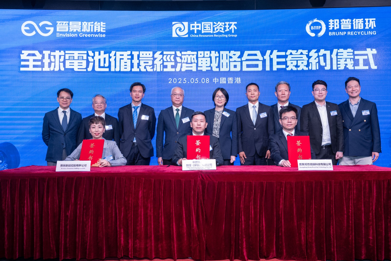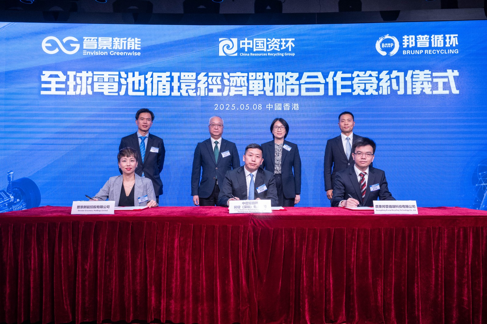 在謝展寰、中資環(huán)國際開發(fā)有限公司董事長喻紅、余海軍、郭晉昇的見證下,中國資源循環(huán)集團綠色投資有限公司晉揚科技公司總經(jīng)理杜贇齊、晉景新能控股有限公司首席營運總監(jiān)郭可兒、廣東邦普循環(huán)科技有限公司投資中心總監(jiān)劉宗淼分別代表三方簽約,標誌著全球電池循環(huán)經(jīng)濟戰(zhàn)略合作正式啟動。