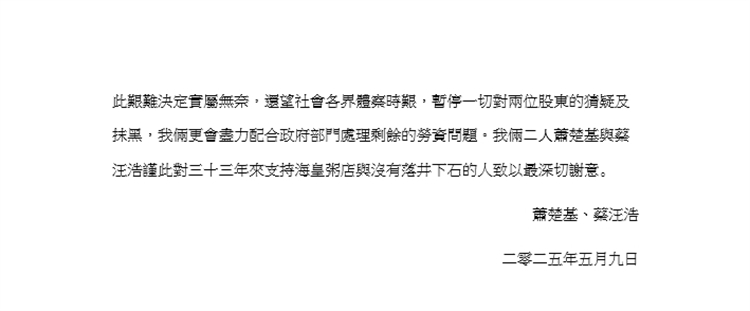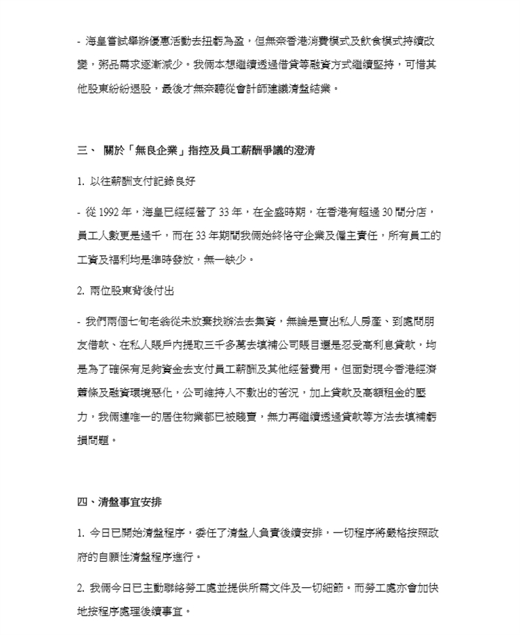 「我倆一直以來都全心全意歇盡所能,用盡一切方法嘗試挽救公司及公司業(yè)務,很可惜因為經(jīng)營環(huán)境極其嚴峻,而無奈結束業(yè)務。」聲明指出,他們已主動聯(lián)絡勞工處並提供所需文件及一切細節(jié)。而勞工處亦會加快地按程序處理後續(xù)事宜,他們更會盡力配合政府部門處理剩餘的勞資問題。望社會各界體察。