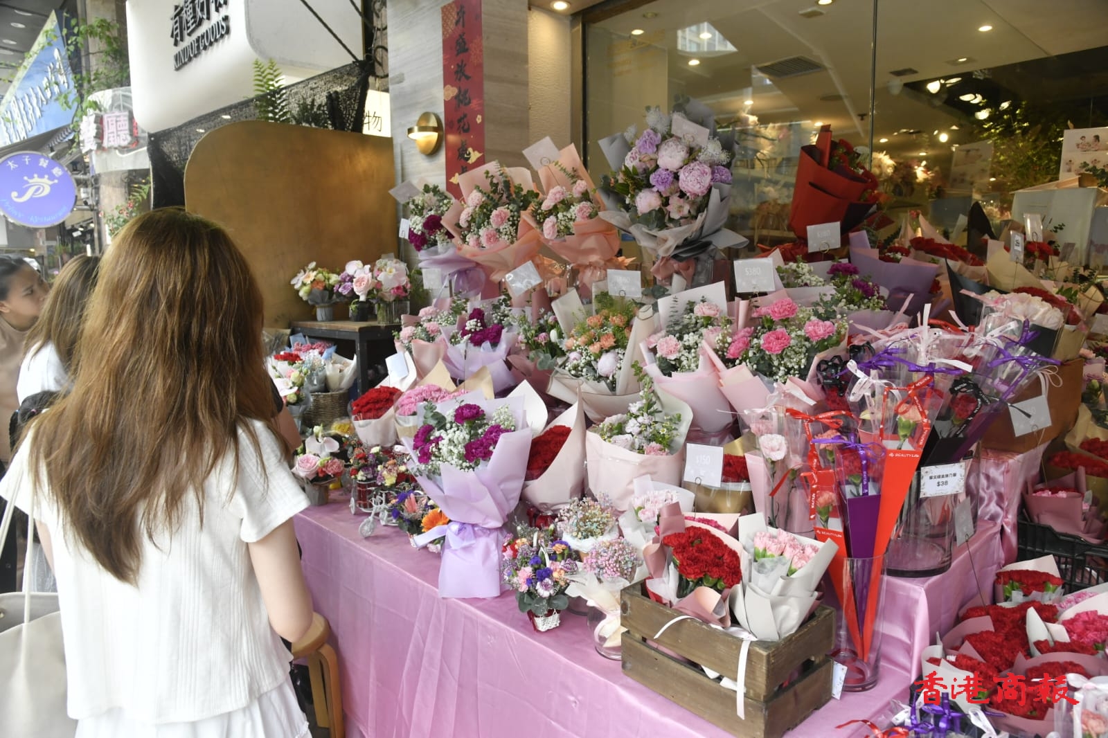 記者轉(zhuǎn)到太子花墟,見到人流比平時假日多出一倍,最多人買的是30至40元一小束的康乃馨,其次是約300元一大束配搭了玫瑰等其他的鮮花。「卉豐花業(yè)」負(fù)責(zé)人梁嘉兒表示,今年鮮花的來貨和零售價均無變,實體店的生意下跌了約2成,幸好他有300多張熟客訂單以及轉(zhuǎn)型網(wǎng)購,令今年生意和往年相若。另外,她也扭盡六壬促銷,加推連青花瓷花瓶的花束,又與蛋糕店和護膚品牌合作,加推連蛋糕或面膜的鮮花套餐。