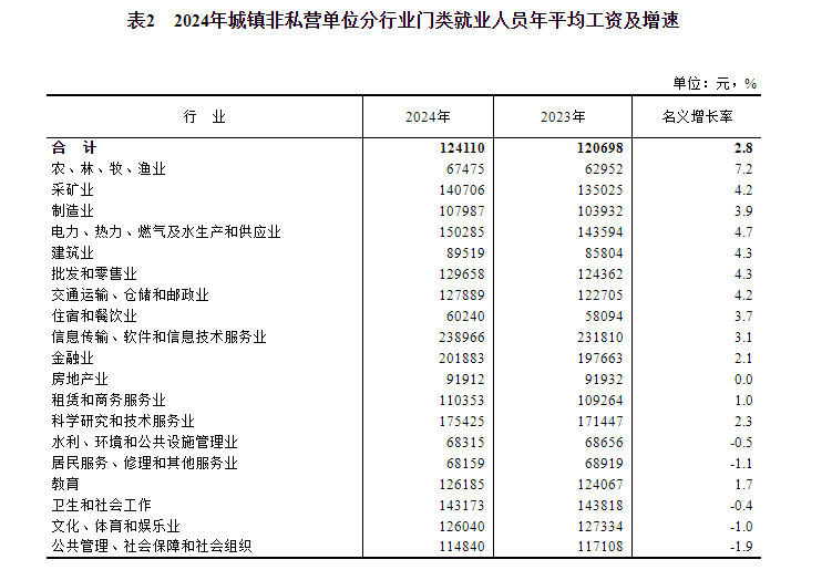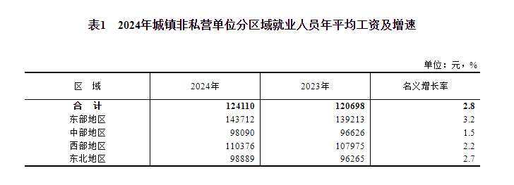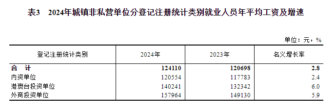 2024年,全國城鎮(zhèn)非私營單位就業(yè)人員年平均工資124110元,比上年增加3412元,名義增長2.8%,按可比口徑增長2.6%。