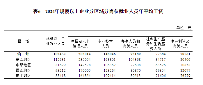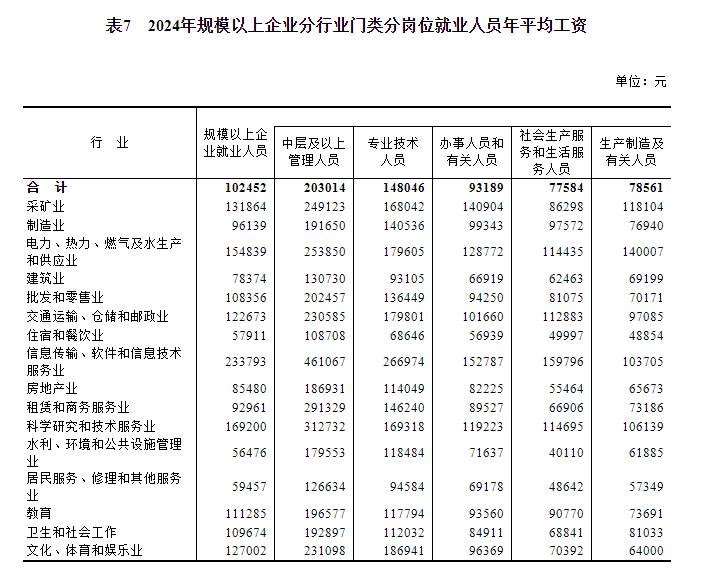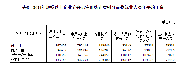 據(jù)國家統(tǒng)計局網(wǎng)站消息,國家統(tǒng)計局今日(16日)公布2024年城鎮(zhèn)單位就業(yè)人員年平均工資情況,2024年全國城鎮(zhèn)非私營單位和私營單位就業(yè)人員年平均工資分別為124110元和69476元;規(guī)模以上企業(yè)就業(yè)人員年平均工資為102452元。其中,中層及以上管理人員203014元,專業(yè)技術(shù)人員148046元,辦事人員和有關(guān)人員93189元,社會生產(chǎn)服務(wù)和生活服務(wù)人員77584元,生產(chǎn)製造及有關(guān)人員78561元。