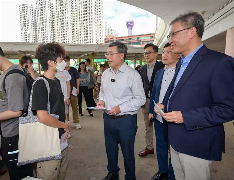在選舉管理委員會主席陸啓康、署理政制及內(nèi)地事務(wù)局局長胡健民、民政事務(wù)總署署長杜潔麗以及沙田民政事務(wù)專員余懷誠等陪同下,卓永興先聽取前線登記職員介紹街站的運(yùn)作情況。