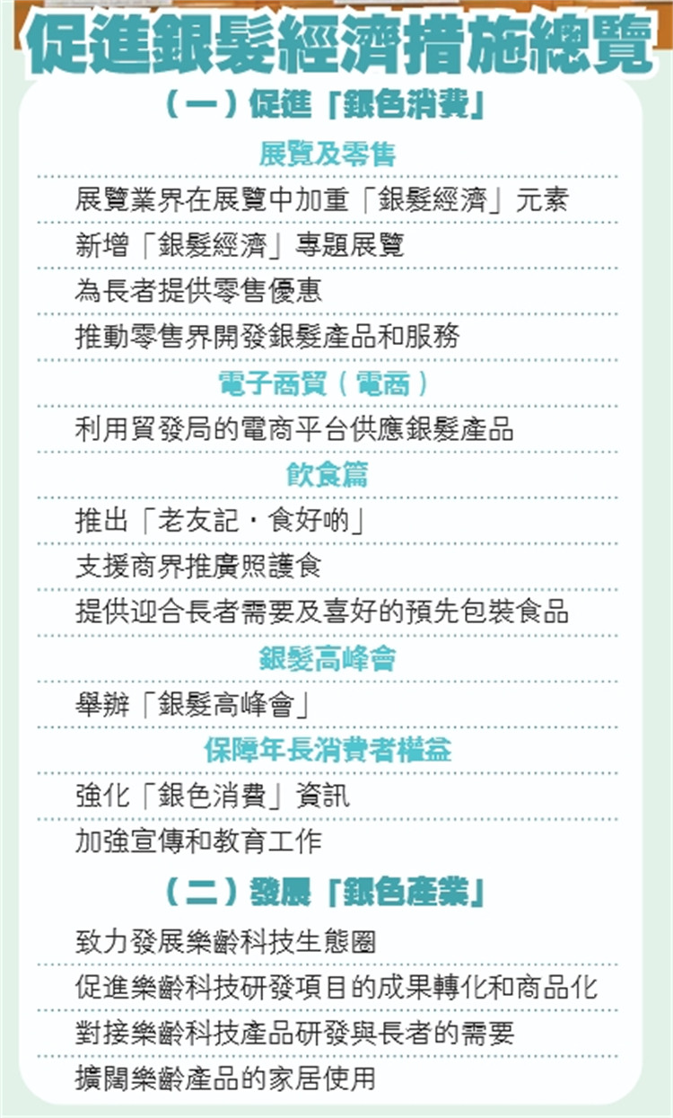 具體而言,促進銀色消費方面涉及11項措施,包括:在展覽中加重銀髮經(jīng)濟元素,如長者免費入場安排、長者專屬優(yōu)惠、銀色產(chǎn)品等;新增「銀髮經(jīng)濟」專題展覽,預(yù)計明年首季舉行;政府與飲食界合作推出「老友記.食好啲」,超過100間餐廳將推出迎合長者喜好的餐飲體驗和優(yōu)惠,預(yù)計今年第三季實施等等。
