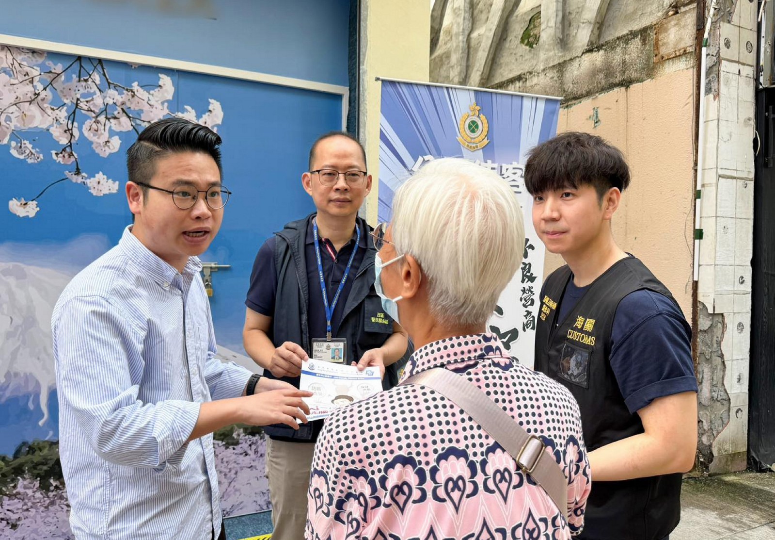 海關(guān)不良營(yíng)商手法調(diào)查課聯(lián)同警方西區(qū)警區(qū)警民關(guān)係組人員,日前於西環(huán)進(jìn)行聯(lián)合宣傳活動(dòng),向區(qū)內(nèi)長(zhǎng)者宣傳有關(guān)公平交易及精明消費(fèi)訊息,提醒 「老友記」要精明消費(fèi),以免被游說下衝動(dòng)消費(fèi)或誤墮消費(fèi)陷阱。同時(shí)向商店進(jìn)行合規(guī)推廣,提醒商戶須要遵守《商品說明條例》規(guī)定。