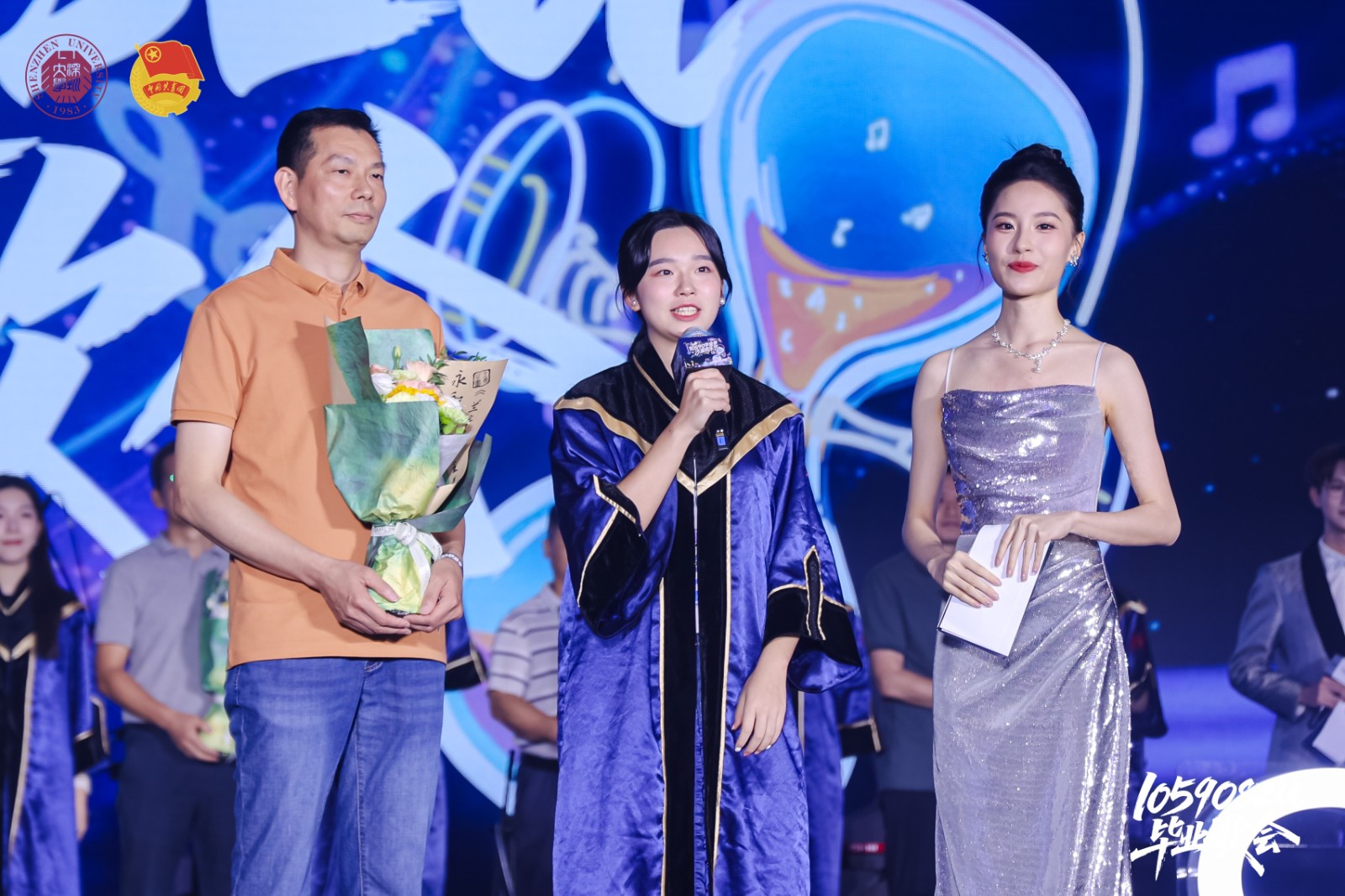 深圳大學(xué)校友、畢業(yè)歌會(huì)執(zhí)行導(dǎo)演魏詩(shī)穎介紹,歌會(huì)節(jié)目安排與學(xué)生在校成長(zhǎng)節(jié)奏一脈相承,恰逢父親節(jié),更以獻(xiàn)花環(huán)節(jié)向父愛(ài)致敬,為這場(chǎng)畢業(yè)盛典注入了更深厚的人文情懷。受邀上臺(tái)的畢業(yè)生父親也激動(dòng)地為深大送上祝福:「希望深大逐夢(mèng)一流!」