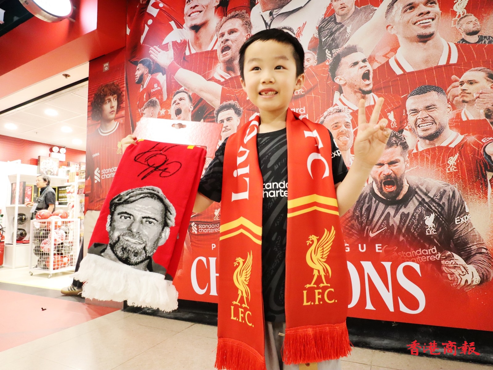 支持球隊(duì)30年的溫先生稱,很興奮有限定店設(shè)立,有很多產(chǎn)品購買,加上球迷會(huì)有九折優(yōu)惠,故會(huì)購物支持。他和兒子購入頸巾、毛巾和一件傳統(tǒng)球衣,還抽到兩條印有前教練高普頭像的頸巾。溫先生介紹球衣是綠白色,設(shè)計(jì)較特別,自己已購入下月球隊(duì)表演賽門票,球星來港踢一場好賽事已很高興,加上一批球迷一起支持同一隊(duì)球隊(duì)會(huì)更開心,啟德新場館一定會(huì)再次入場,因球場很舒服、很漂亮,加上鄰近民居和地鐵站,有賽事一定會(huì)支持。(圖:馮瀚文攝)