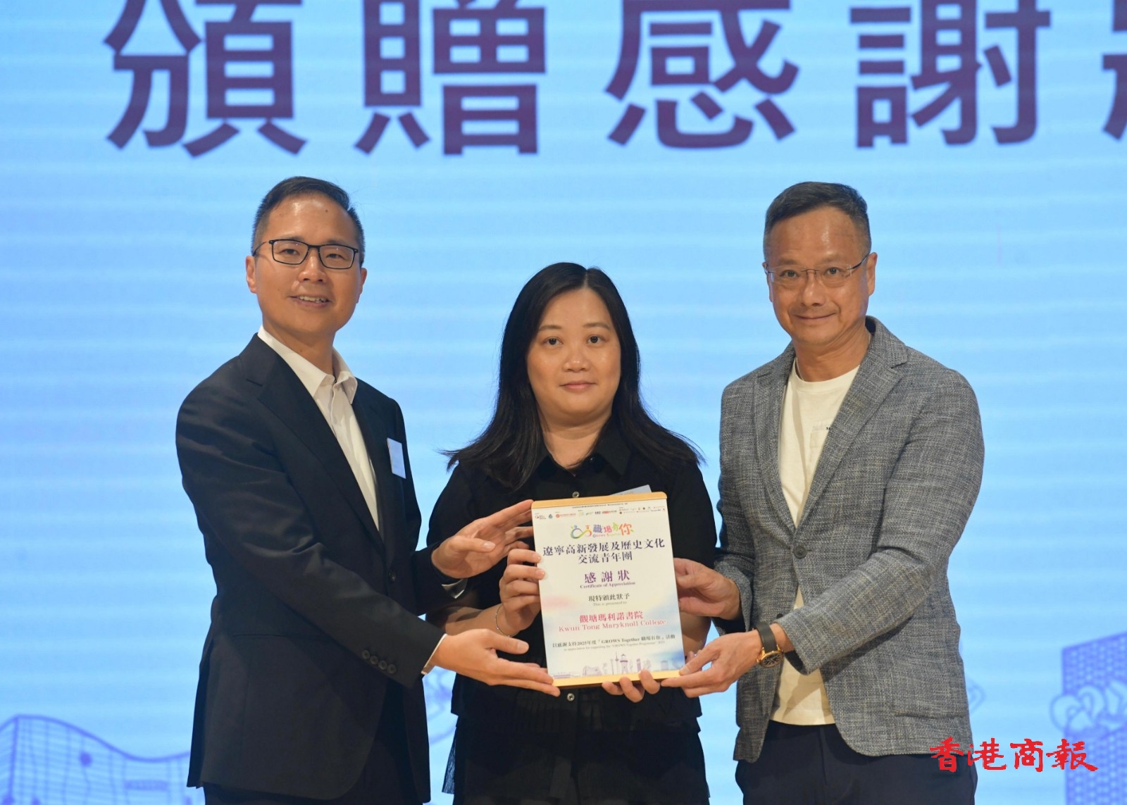 香港警務(wù)處助理處長、東九龍指揮官羅越榮(左)向觀塘瑪利諾書院校長冼雅琳(中)頒發(fā)感謝狀。記者 崔俊良攝
