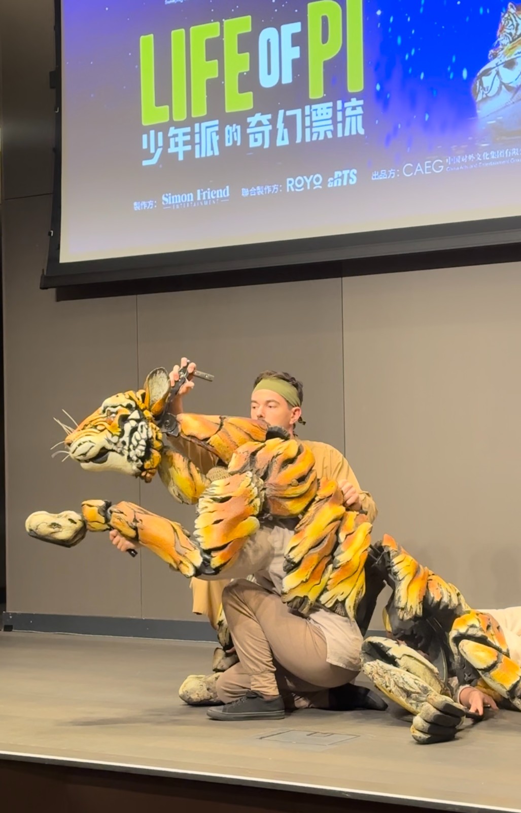 本次演出中最受矚目的是「偶」。例如三位操偶師精密操縱孟加拉虎「理查·派克」,包括頭部、前肢和尾部的協(xié)同配合,以及每一次呼吸與咆哮。逼真度令人驚歎 。此外,舞臺利用流動布景、燈光投影等視效技術,重現(xiàn)海上風暴、魚群遊動等場景,為觀眾構建沉浸式「漂流體驗」 。