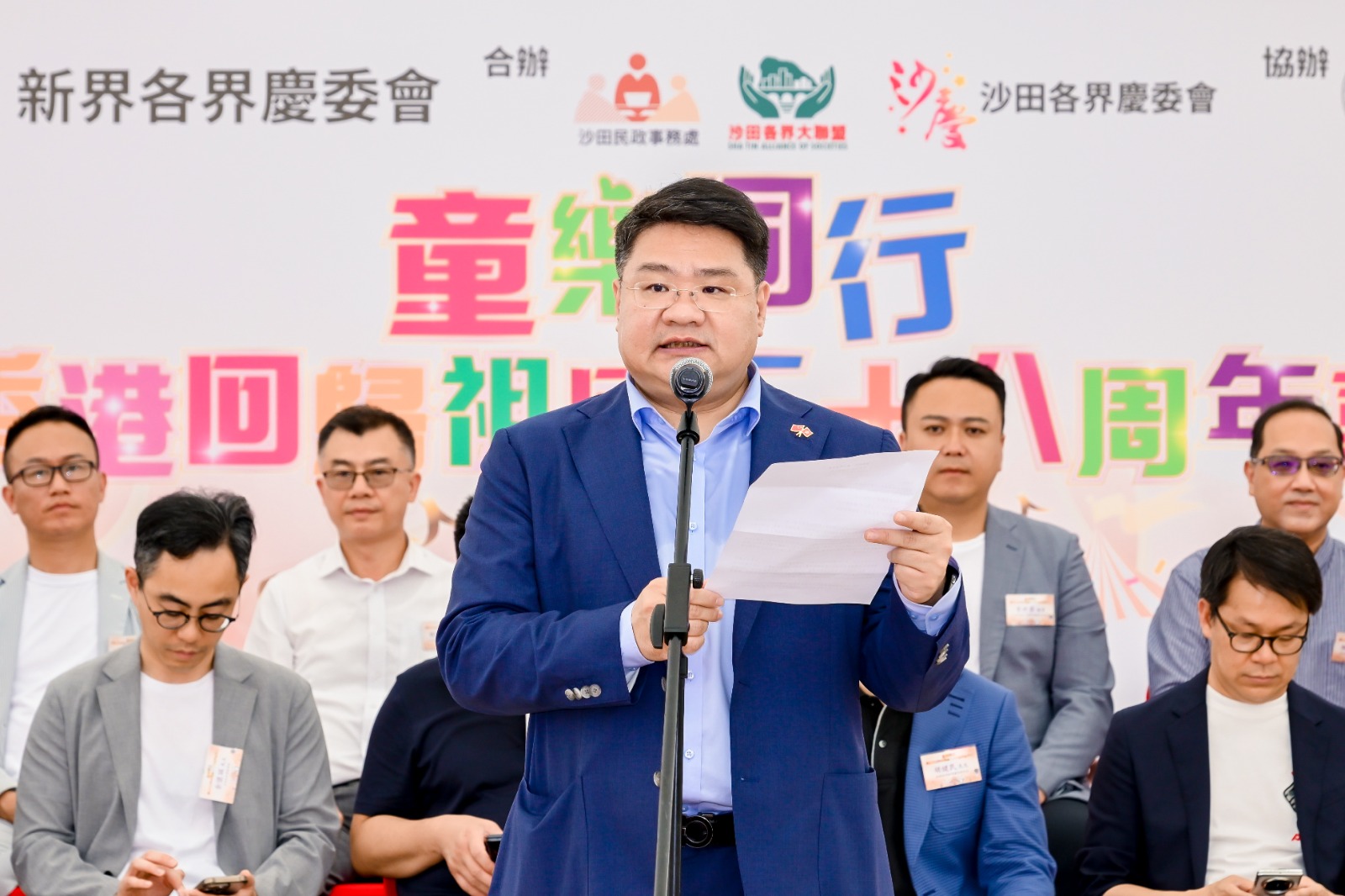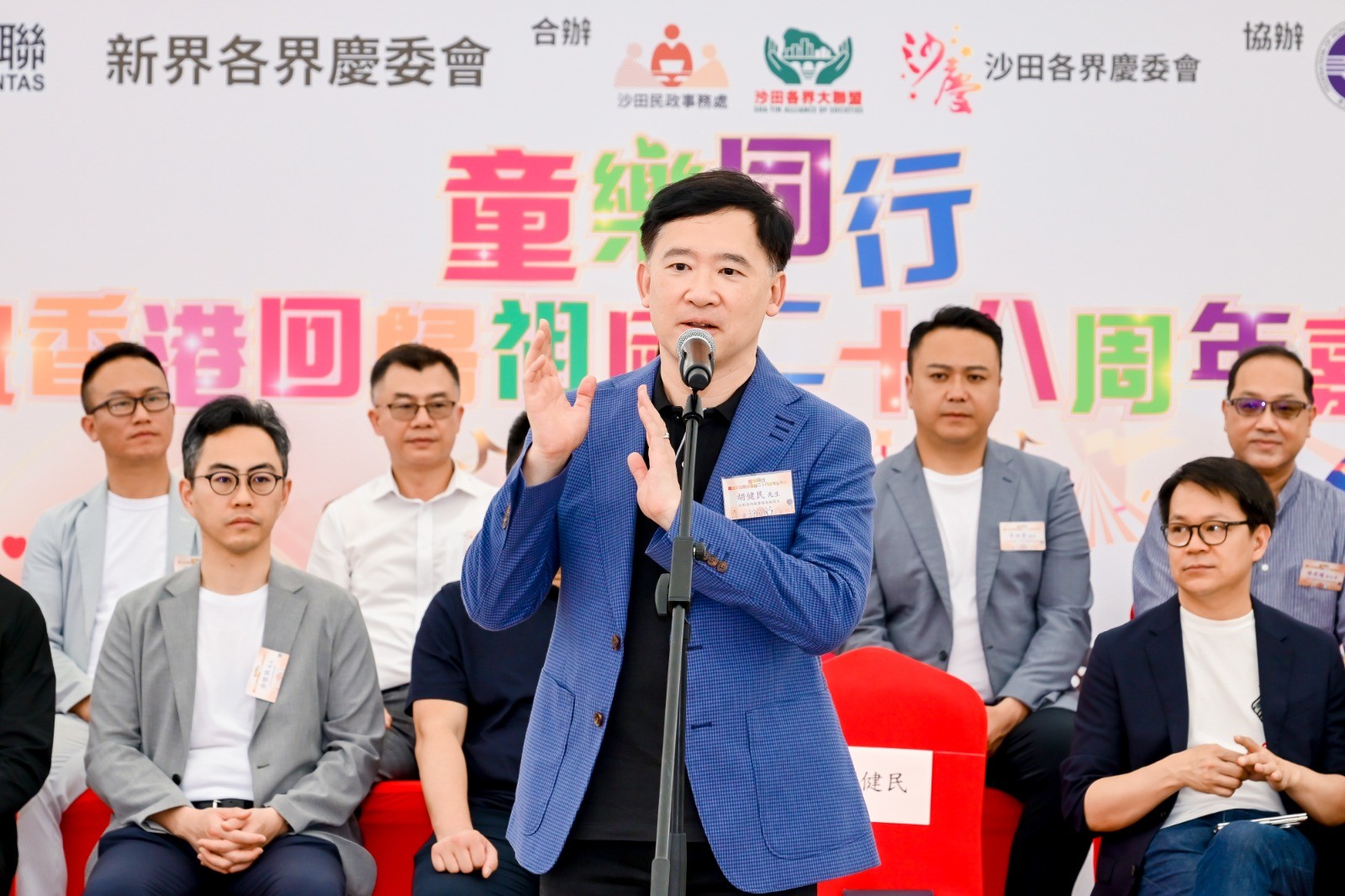 由新界社團(tuán)聯(lián)會、新界各界慶委會主辦,沙田民政事務(wù)處、沙田各界大聯(lián)盟、沙田各界慶委會合辦的「童樂同行」慶回歸嘉年華昨日(29日)於沙田公園順利舉行。政制及內(nèi)地事務(wù)局副局長胡健民、中央政府駐港聯(lián)絡(luò)辦新界工作部副部長王卉,行政會議成員、民建聯(lián)主席陳克勤,沙田民政事務(wù)專員余懷誠等嘉賓蒞臨主禮,港區(qū)全國人大代表召集人、新界社團(tuán)聯(lián)會會長陳勇,新界社團(tuán)聯(lián)會理事長譚鎮(zhèn)國,全國人大代表、新界各界慶委會主席李聖潑等出席。