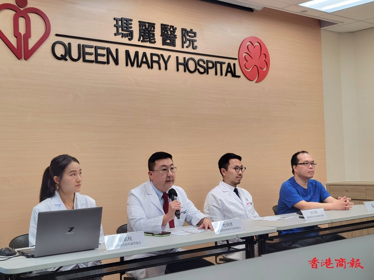 頂圖圖説:瑪麗醫(yī)院神經(jīng)外科顧問(wèn)醫(yī)生杜明德(左二)、瑪麗醫(yī)院內(nèi)科駐港??漆t(yī)生梁宇軒(右二)、瑪麗醫(yī)院放射科顧問(wèn)醫(yī)生劉凱桃(左一)、康復(fù)患者羅先生(右一)。(實(shí)習(xí)記者邢子豪攝)