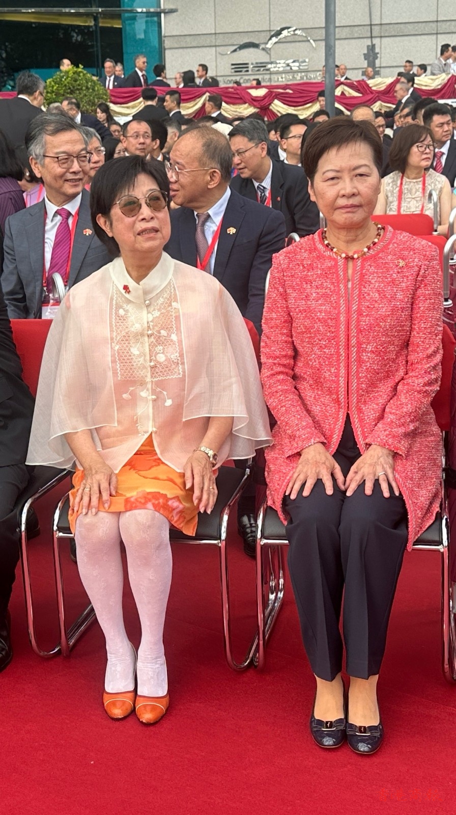 行政長官李家超(前排中)及其夫人(前排右十)、署理終審法院首席法官李義(前排右九)及其夫人(前排右八)、前任行政長官曾蔭權(quán)(前排右七)及其夫人(前排右六)、全國政協(xié)副主席梁振英(前排左十)及其夫人(前排左九)、前任行政長官林鄭月娥(前排右五)、中央人民政府駐香港特別行政區(qū)聯(lián)絡(luò)辦公室主任周霽(前排左八)、中央人民政府駐香港特別行政區(qū)維護國家安全公署署長董經(jīng)緯(前排左七)、外交部駐香港特別行政區(qū)特派員公署特派員崔建春(前排左六)及其夫人(前排左五)、中國人民解放軍駐香港部隊司令員彭京堂少將(前排左四)、中國人民解放軍駐香港部隊政治委員賴如鑫海軍少將(前排左三)、政務(wù)司司長陳國基(前排右四)、財政司司長陳茂波(前排右三)、律政司司長林定國資深大律師(前排右二)、立法會主席梁君彥(前排左二)、行政會議非官守議員召集人葉劉淑儀(前排右一)和主要官員及嘉賓,今日在灣仔金紫荊廣場出席香港特區(qū)成立28周年升旗儀式。政府新聞處