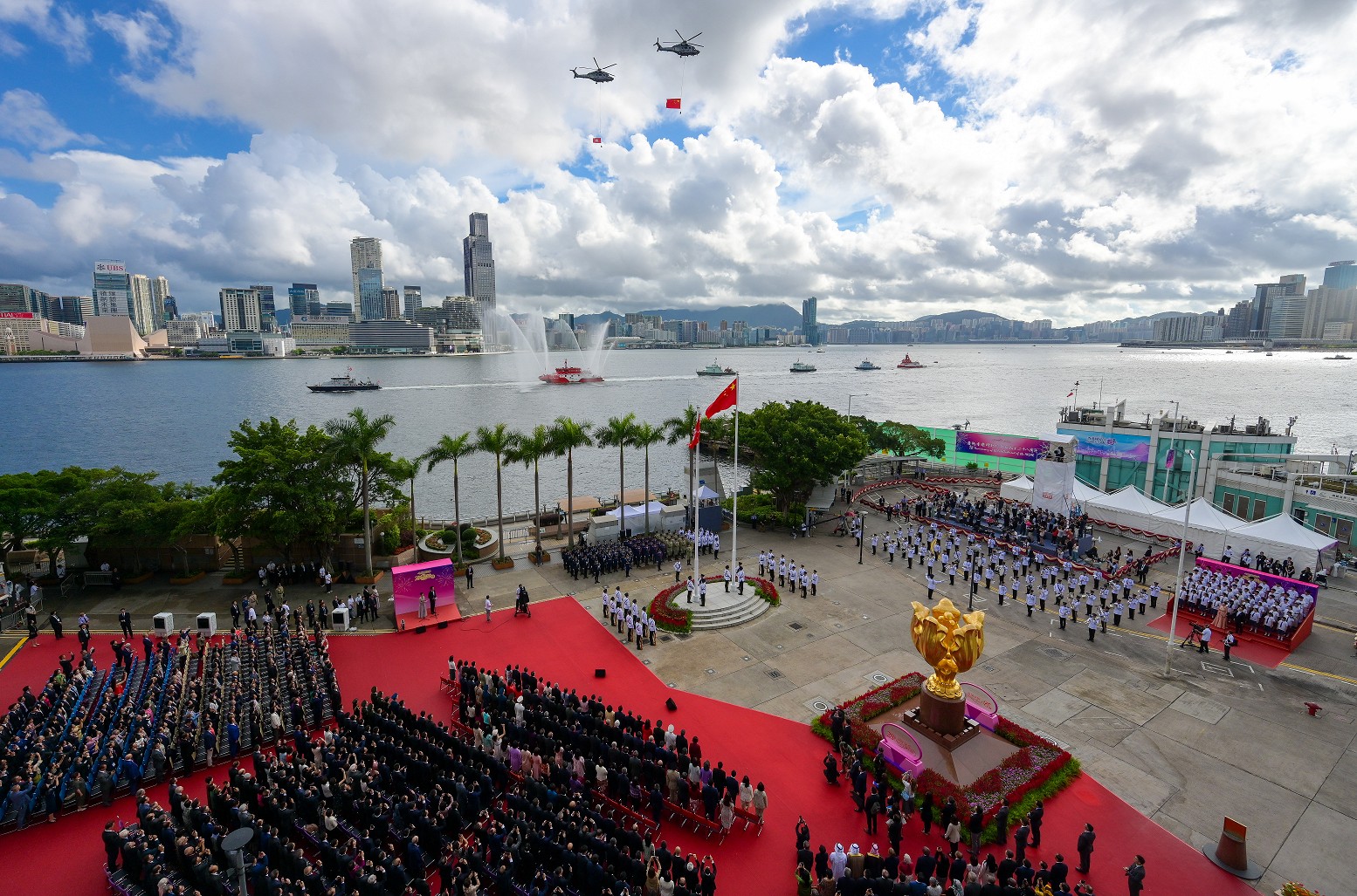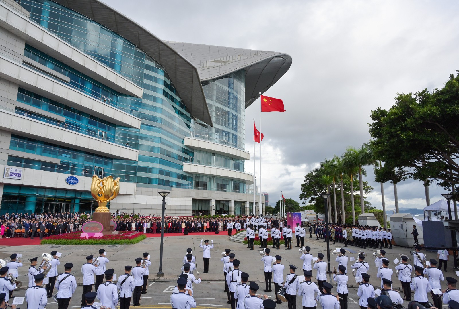 警察銀樂隊在現(xiàn)場奏樂,護旗方隊及儀仗隊以中式步操進場,隊護送國旗和區(qū)旗到旗桿位置。升旗時,全體嘉賓肅立面向國旗和區(qū)旗,並合唱國歌。當國旗和區(qū)旗升上桿頂之後,飛行服務(wù)隊兩架直升機分別懸掛國旗及區(qū)旗,飛越維港上空,消防船及水警輪則在會展對開海面噴水花致敬。