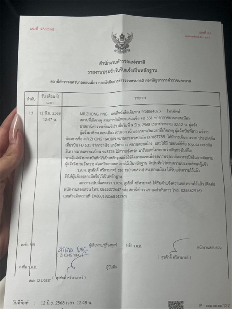 一名衷姓女士在微博發(fā)文稱,其弟弟衷浩彬從事模特工作已經(jīng)四年半,因接到雜誌封面拍攝邀請, 6月8日晚上12點(diǎn)33分在廣州白雲(yún)機(jī)場乘坐飛機(jī)FD531到泰國廊曼機(jī)場,2025年6月9日凌晨2點(diǎn)12到達(dá)泰國廊曼機(jī)場。凌晨3點(diǎn)15分,他在泰國廊曼機(jī)場6號門坐上了一輛車牌號: ??3726 ????????的Toyota私家車,被帶到泰國達(dá)府後失聯(lián),原本預(yù)訂的酒店(B Your Home Hotel Donmueang Airport Bangkok)也並未入住。
