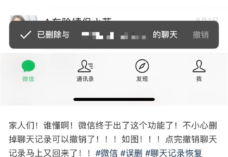 近日,有多名網(wǎng)友發(fā)帖稱,發(fā)現(xiàn)微信聊天記錄誤刪後可以撤銷操作了。