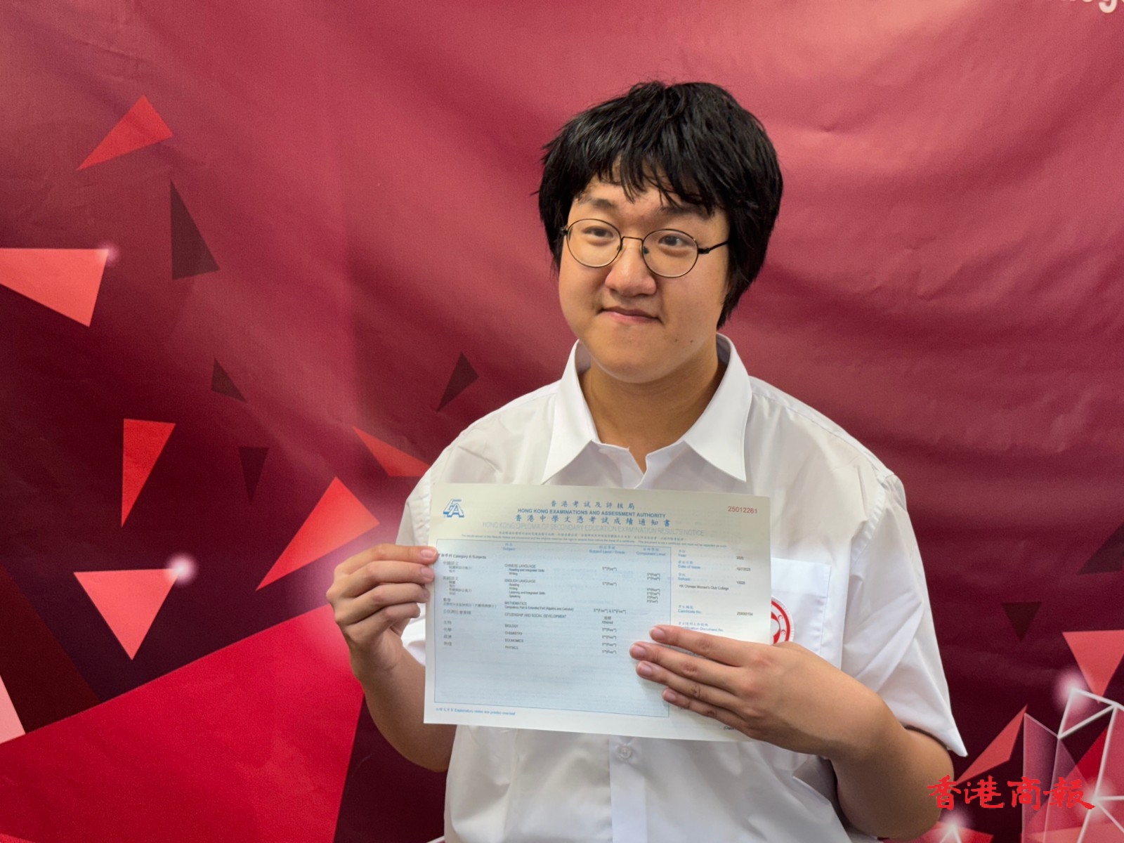 中國(guó)婦女會(huì)中學(xué)男生王海博考獲8科5星星,他在中英數(shù)3科、數(shù)學(xué)科延伸部分(俗稱M1及M2)、以及另外 4 科選修科都悉數(shù)獲得5**成績(jī)。