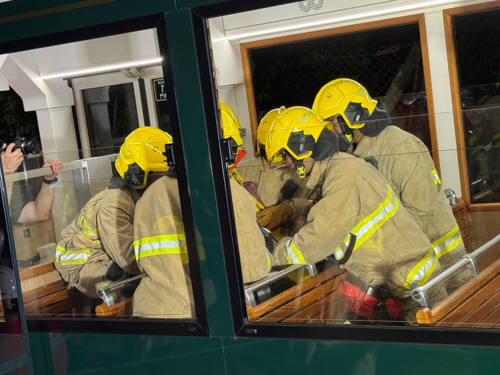演習(xí)模擬一顆大石滾入車底,導(dǎo)致纜車突然停下並引致乘客受傷。各部門迅速到場(chǎng)展開救援工作,設(shè)立緊急車輛通道、傷者集合點(diǎn)及分流站,將乘客及傷者疏散到最近的麥當(dāng)勞道站。