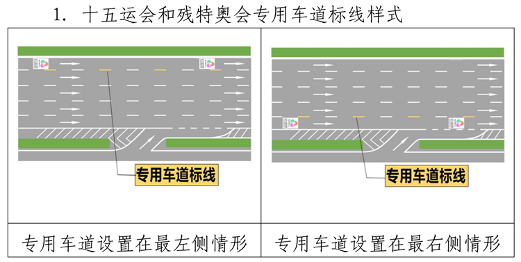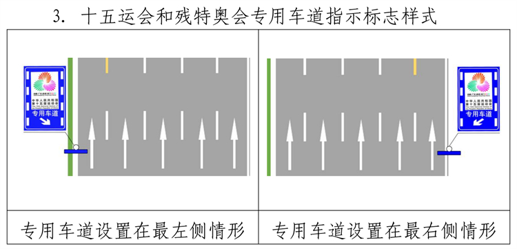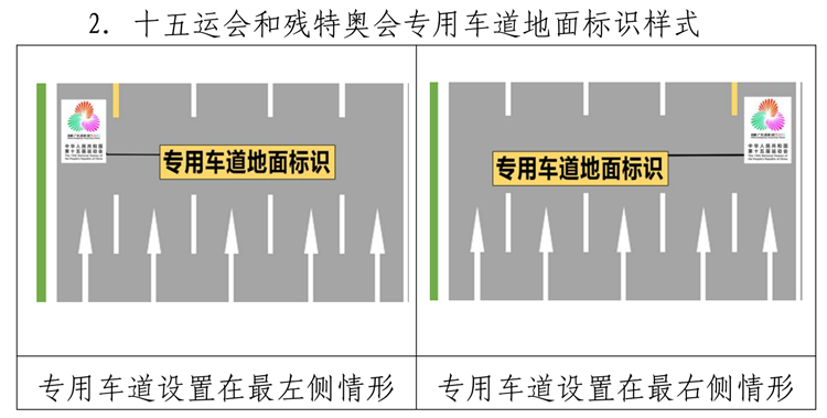 十五運(yùn)會(huì)和殘?zhí)貖W會(huì)專用車道標(biāo)線由黃色、白色間隔虛線組成,地面標(biāo)識為白底彩色十五運(yùn)會(huì)和殘?zhí)貖W會(huì)會(huì)徽圖案組成,指示標(biāo)誌由藍(lán)底(或綠底)白色虛線、箭頭及白底彩色會(huì)徽組成。