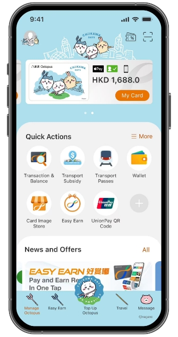 購買手機版八達通「CHIIKAWA DAYS」主題卡面後,CHIIKAWA會出現(xiàn)在八達通APP的啟動畫面及主頁介面。(八達通圖片)