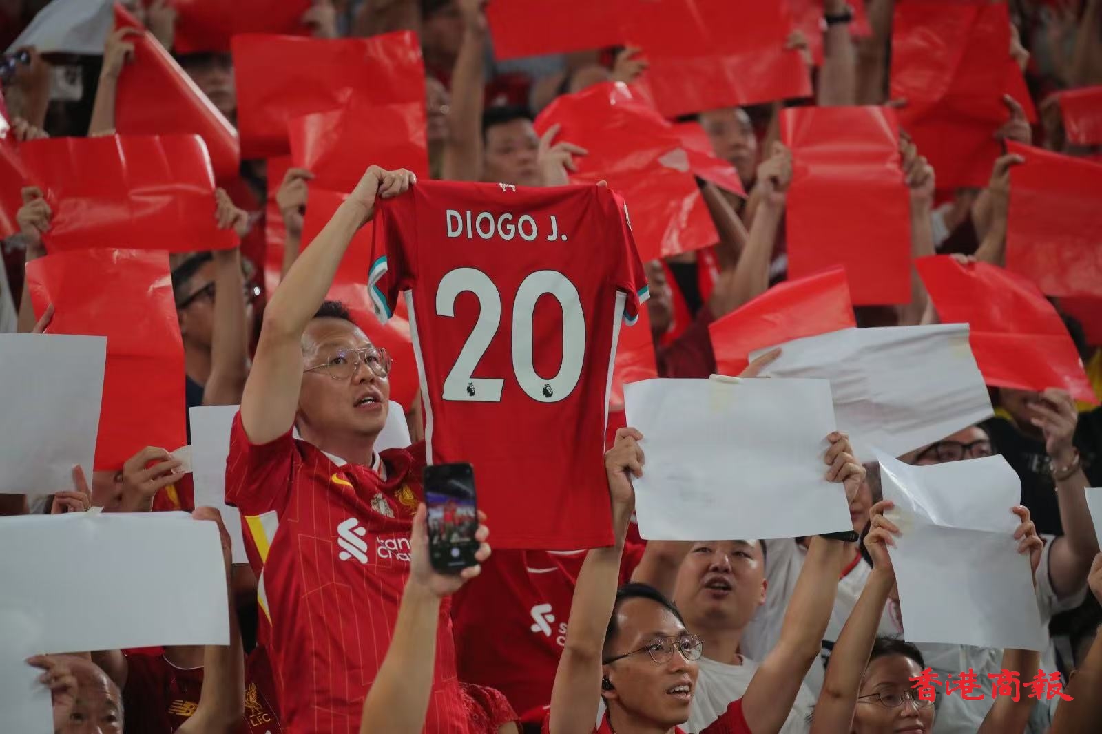 今晚的啟德體育園主場館全場爆滿,由於兩支「紅」軍對賽,現(xiàn)場一片紅海,場面十分壯觀。利物浦球迷賽前用紙牌砌成了「DJ20」的圖案,悼念月初因意外不幸離世的前鋒迪亞高祖達。
