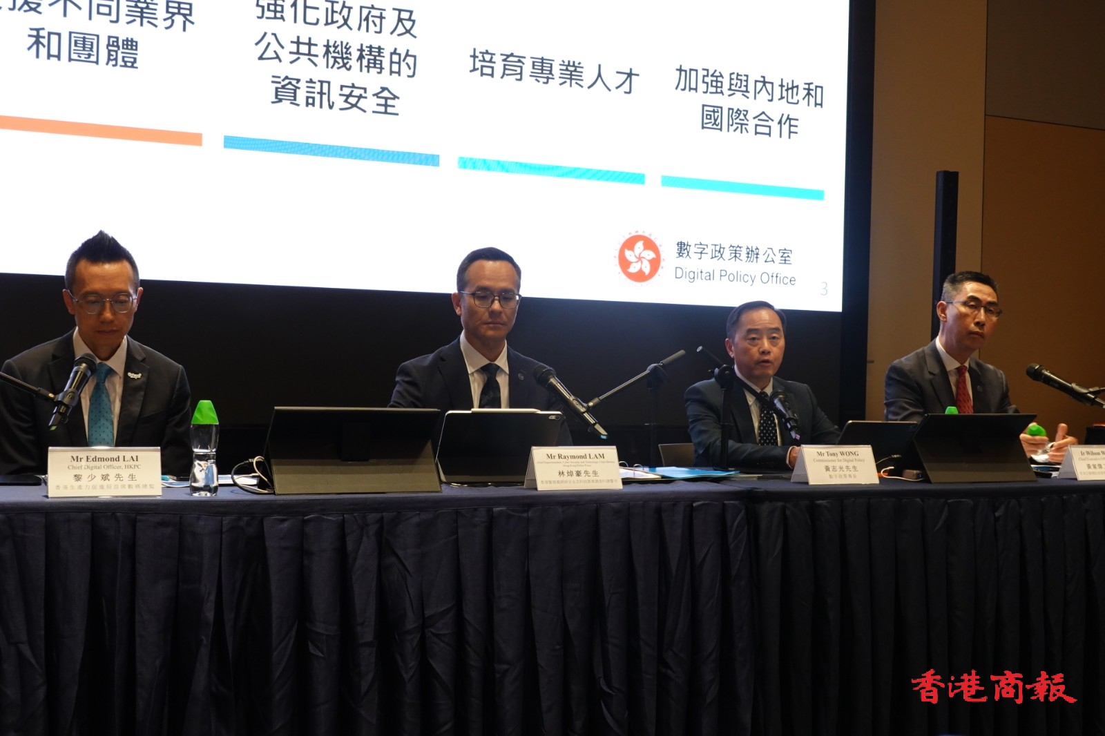 數(shù)字政策專員黃志光(右二)、香港警務(wù)處網(wǎng)絡(luò)安全及科技罪案調(diào)查科總警司林焯豪(左二)、香港互聯(lián)網(wǎng)註冊(cè)管理有限公司行政總裁黃家偉(右一),以及香港生產(chǎn)力促進(jìn)局首席數(shù)碼總監(jiān)黎少斌(左一)會(huì)見傳媒。林駿強(qiáng)攝
