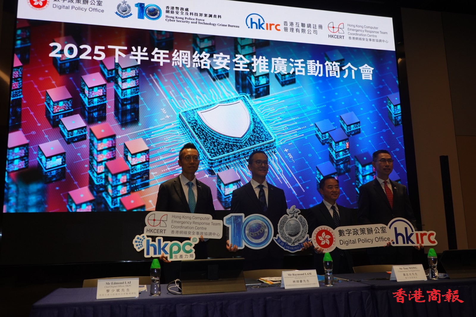 數(shù)字政策專員黃志光、香港警務(wù)處網(wǎng)絡(luò)安全及科技罪案調(diào)查科總警司林焯豪、香港互聯(lián)網(wǎng)註冊(cè)管理有限公司行政總裁黃家偉,以及香港生產(chǎn)力促進(jìn)局(生產(chǎn)力局)首席數(shù)碼總監(jiān)黎少斌,今日舉行記者會(huì),簡(jiǎn)介今年下半年網(wǎng)絡(luò)安全推廣活動(dòng)。