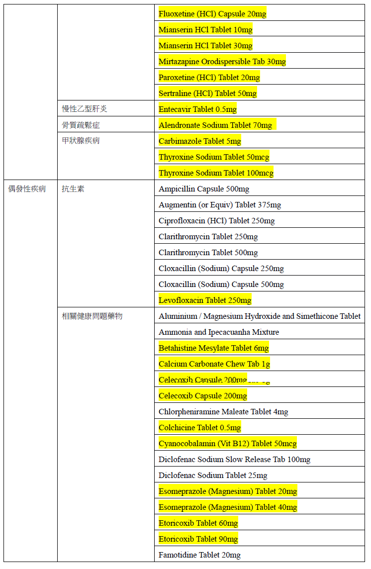 經(jīng)檢視參加者的實際需求後,政府由8月1日起在基本藥物名單增添55項藥物,包括抗抑鬱藥、用於治療慢性乙型肝炎、骨質(zhì)疏鬆癥及甲狀腺疾病藥物。此外,名單亦增加更多針對與偶發(fā)性疾病相關(guān)健康問題的藥物,如紓緩哮喘和痛風(fēng)、緩解噁心和眩暈的藥物。擴大後的名單所涵蓋的基本藥物總數(shù)會由原來的59項增加至114項,為家庭醫(yī)生提供更大彈性,以照顧參加者的臨床需求。最新的基本藥物名單詳見附件。