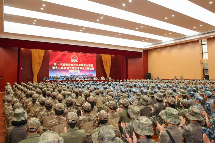 第十八屆香港青少年軍事夏令營暨第十二屆香港大學(xué)生軍事生活體驗(yàn)營8月1日下午在中國人民解放軍駐香港部隊(duì)新圍軍營舉行開營儀式。來自香港190餘所學(xué)校約500名青少年入營。