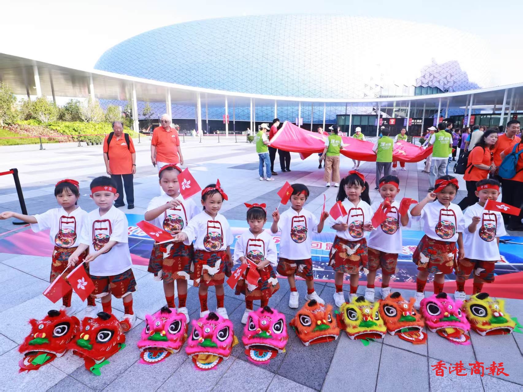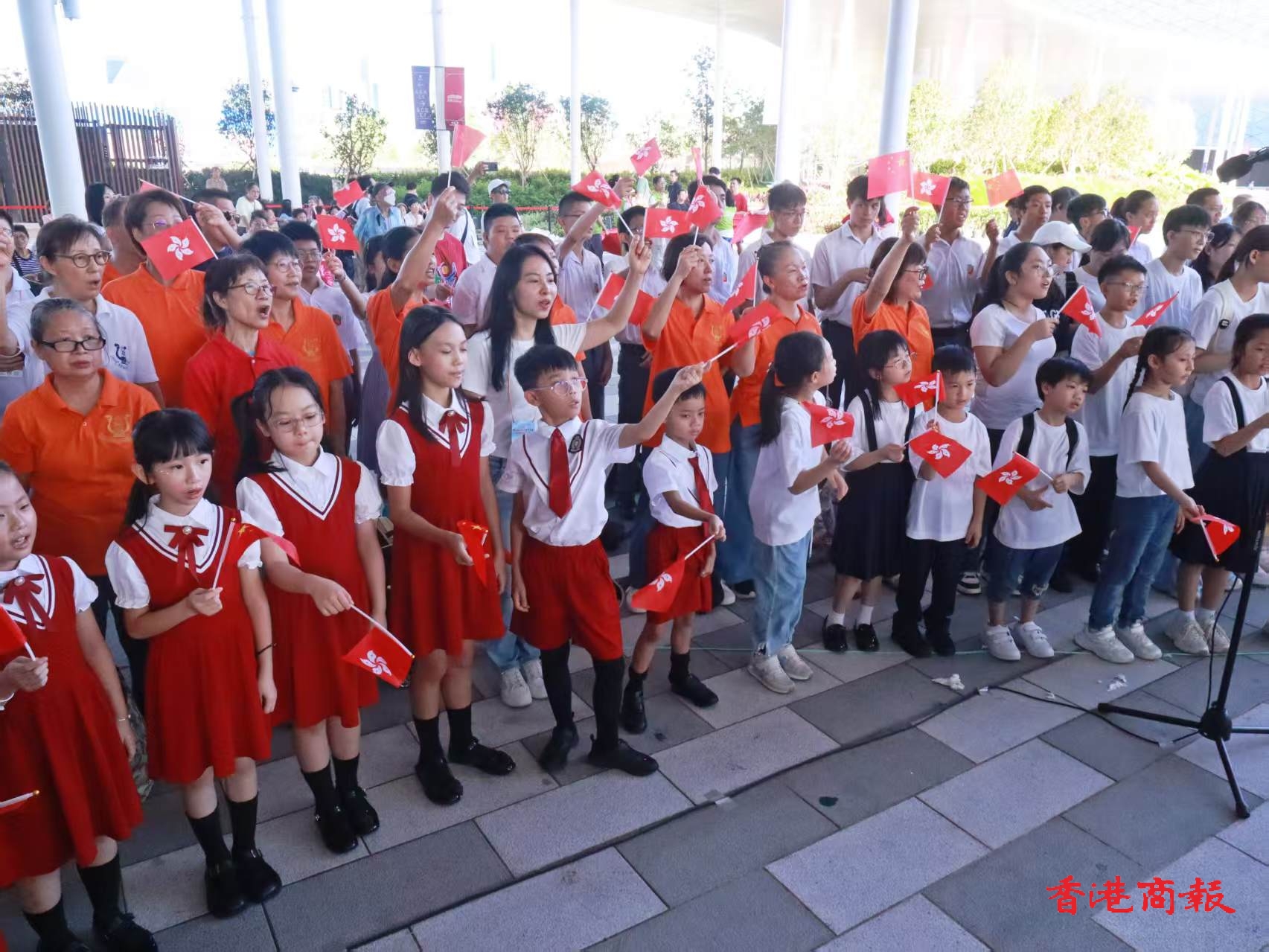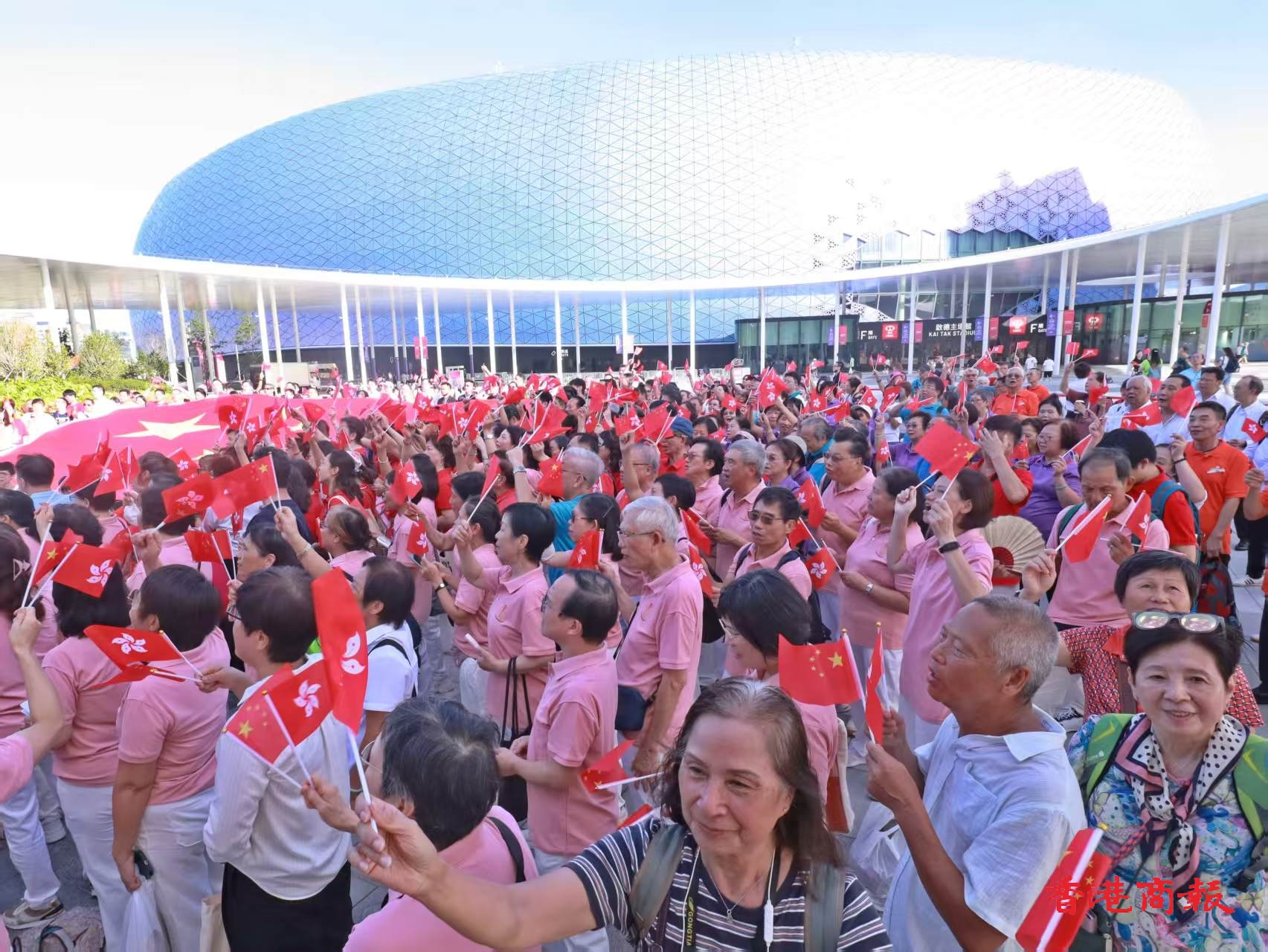 群眾們揮動國旗和特區(qū)區(qū)旗,場面壯觀。