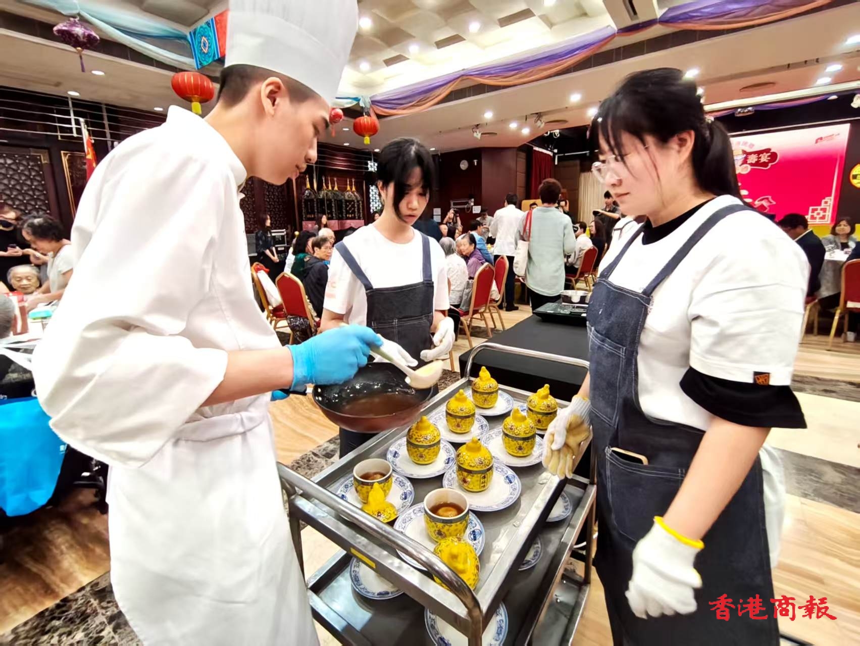 繼去年推出懷舊點心軟餐後,嗇色園今年跟職業(yè)訓練局的機構(gòu)成員,香港專業(yè)教育學院(IVE)及中華廚藝學院(CCI),合作研發(fā)適合長者食用的「軟餐佛跳牆」,今日(20日)在嗇色園黃大仙祠,舉行「軟餐佛跳牆」百人壽宴及嘉許禮,和40位壽星長者,一起品嚐這道傳統(tǒng)名菜?;顒友埖絼诠ぜ案@指本珠L何啟明、嗇色園董事會主席黎澤森、職訓局副執(zhí)行幹事任影倩擔任主禮嘉賓。