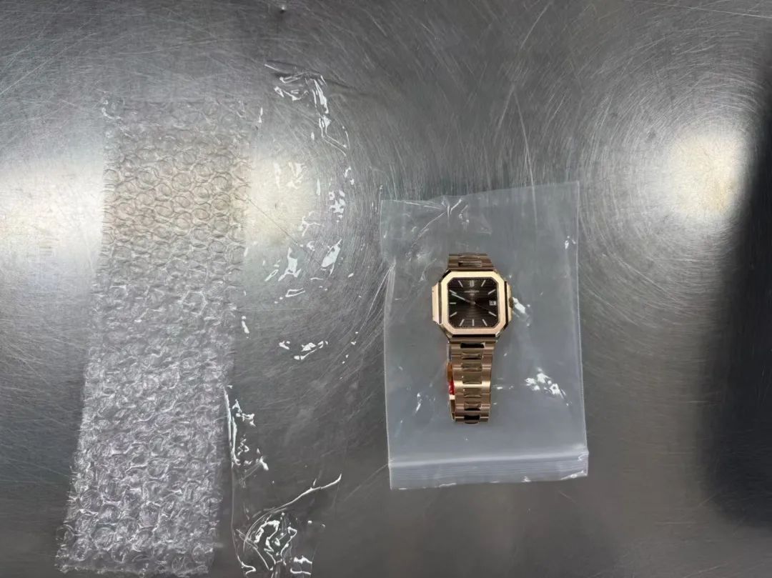 羅湖海關(guān)在對進(jìn)境旅客進(jìn)行監(jiān)管時,發(fā)現(xiàn)一名男性旅客進(jìn)入海關(guān)監(jiān)管區(qū)未向海關(guān)申報(bào),且步履匆忙,企圖快速離開海關(guān)監(jiān)管區(qū),海關(guān)關(guān)員隨即對其進(jìn)行攔截檢查。經(jīng)檢查,海關(guān)關(guān)員在該旅客褲子口袋內(nèi)發(fā)現(xiàn)塑膠膜1張及透明密封袋1個。經(jīng)進(jìn)一步檢查,海關(guān)關(guān)員發(fā)現(xiàn)該旅客左手戴未拆保護(hù)膜的疑似全新百達(dá)翡麗(Patek Philippe)手表1隻。