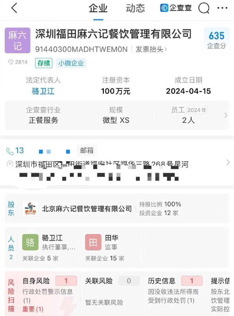 企查查信息顯示,該公司成立於2024年4月,註冊資本100萬,由北京麻六記餐飲管理有限公司全資持股。