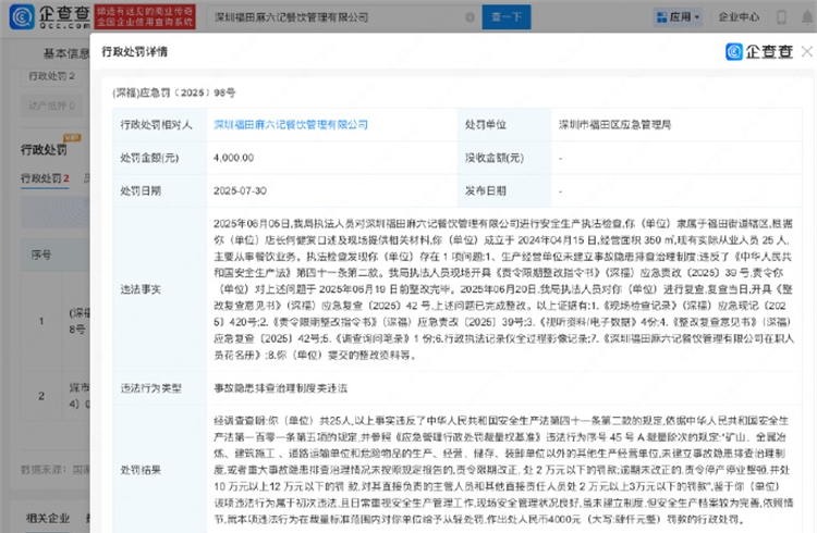 企查查APP顯示,近日,深圳福田麻六記餐飲管理有限公司被深圳市福田區(qū)應(yīng)急管理局行政處罰4000元。違法事實顯示,2025年6月5日,執(zhí)法人員對其進行安全生產(chǎn)執(zhí)法檢查,發(fā)現(xiàn)存在「生產(chǎn)經(jīng)營單位未建立事故隱患排查治理制度」問題,違反了《中華人民共和國安全生產(chǎn)法》第四十一條第二款。後經(jīng)復(fù)查上述問題已完成整改。