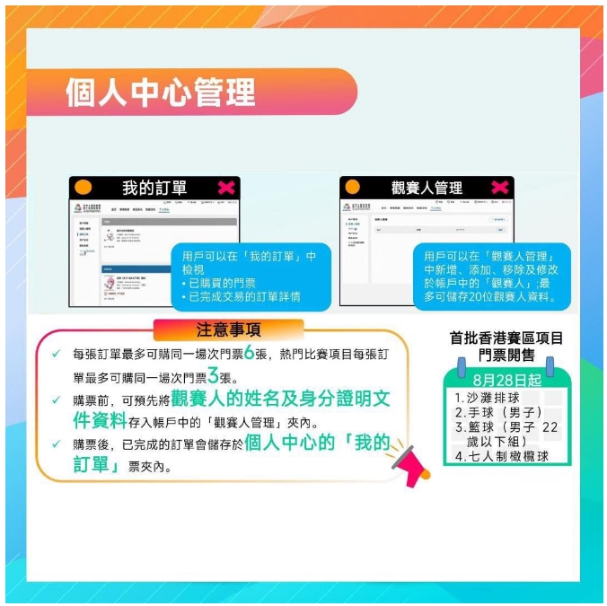陳國(guó)基說(shuō),三地採(cǎi)用「一個(gè)平臺(tái)、三地購(gòu)票」的做法,同一個(gè)網(wǎng)上平臺(tái)可以購(gòu)買到不同賽區(qū)的門票,非常方便。香港市民購(gòu)買香港和澳門賽區(qū)門票時(shí)記得要使用香港身份證;購(gòu)買廣東賽區(qū)項(xiàng)目門票時(shí)則須使用回鄉(xiāng)證。每張訂單最多可購(gòu)買同一場(chǎng)次的6張門票;熱門比賽項(xiàng)目每張訂單最多可購(gòu)買同一場(chǎng)次的3張門票。註冊(cè)用戶只須預(yù)先輸入一起觀賽親友的資料,購(gòu)票時(shí)就會(huì)更加便捷。他又說(shuō),未登記的朋友可先上十五運(yùn)會(huì)官方票務(wù)網(wǎng)站或微信小程序登記。