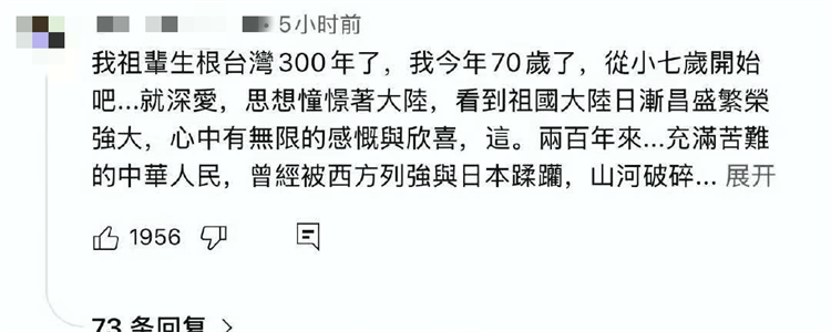 什麼是島內(nèi)真實(shí)的聲音?就是臺(tái)灣網(wǎng)民一句句發(fā)自肺腑的留言:「中國(guó)的驕傲=臺(tái)灣的驕傲!」「我是中國(guó)人,我的祖國(guó)叫中國(guó)?!埂高@絕對(duì)是至今為止,全世界最棒的閱兵」。他們用最直接的方式告訴世人:絕大多數(shù)臺(tái)灣民眾從未忘記自己是中國(guó)人。九三閱兵不僅是紀(jì)念抗戰(zhàn)勝利的儀式,更是一場(chǎng)心靈震撼,讓越來越多的臺(tái)灣人重新認(rèn)識(shí)自己的身份和未來。真正的歷史,正在島內(nèi)民眾長(zhǎng)長(zhǎng)的留言裏生長(zhǎng)。