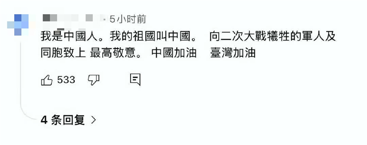 「我是中國(guó)人。我的祖國(guó)叫中國(guó)。向二次大戰(zhàn)犧牲的軍人及同胞致上最高敬意。中國(guó)加油,臺(tái)灣加油?!埂肝易孑吷_(tái)灣300年了,我今年70歲了,看到祖國(guó)大陸日漸昌盛繁榮強(qiáng)大,心中有無限的感慨與欣喜,兩百年來充滿苦難的中華人民,曾經(jīng)被西方列強(qiáng)與日本蹂躪,山河破碎的大陸,能如此強(qiáng)大崛起,太不容易了,我感慨,我感動(dòng),不禁眼眶泛紅,祝願(yuàn)祖國(guó)大陸昌盛繁榮,強(qiáng)大康健?!?/span>