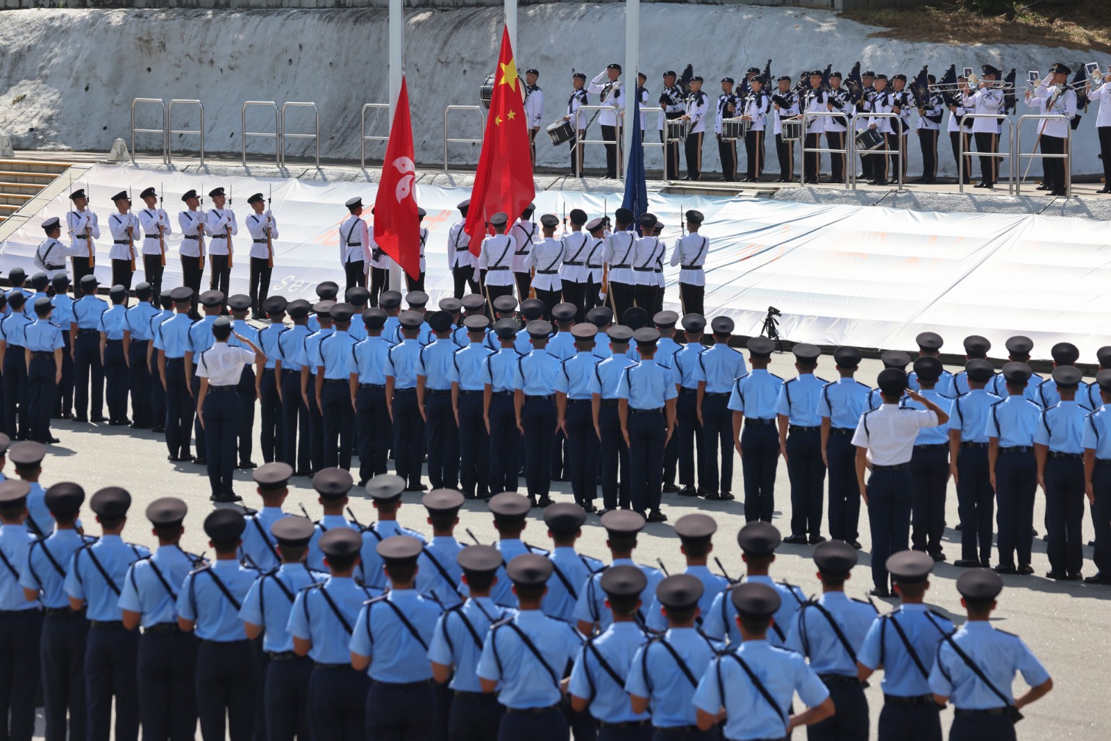 政務(wù)司司長陳國基今日(6日日)出席香港警察學(xué)院結(jié)業(yè)會操,檢閱30名見習(xí)督察及182名學(xué)警,見證他們正式成為警隊的一分子。陳國基發(fā)表致辭時對結(jié)業(yè)的督察和警員提出四點期盼,包括:永葆忠誠,恪守法律;精確專業(yè)、擁抱變革;心繫社群、仁勇兼?zhèn)洌患靶貞鸭覈?、放眼世界?br/>