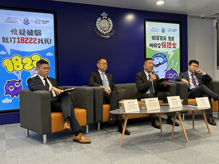 左起:香港青年協(xié)會副總幹事陳文浩、香港金融管理局助理總裁(法規(guī)及打擊洗黑錢)陳景宏、警務(wù)處商業(yè)罪案調(diào)查科高級警司羅國凱、香港理工大學(xué)徐鑫教授。