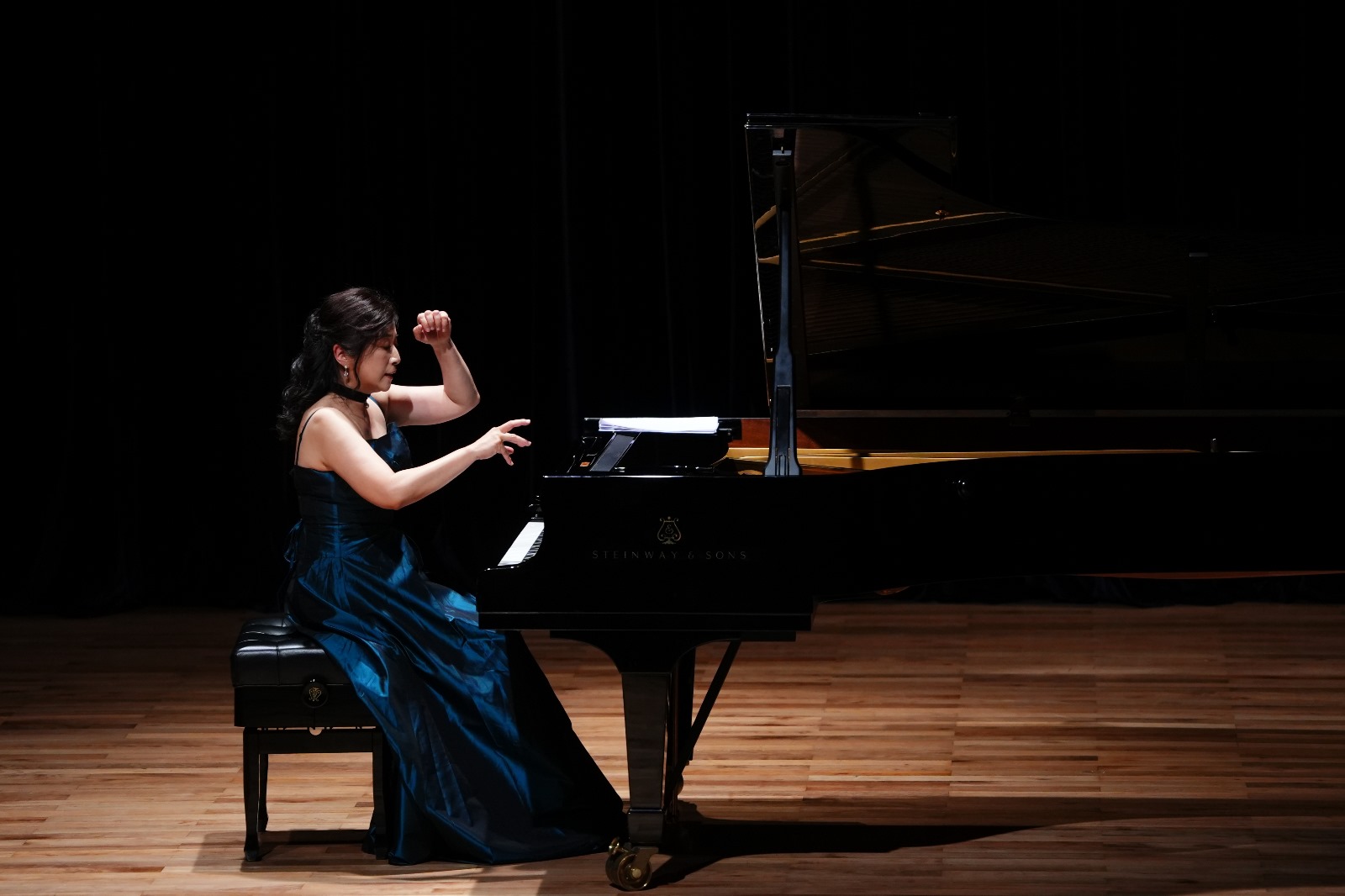 鄭慧隨即彈出的《日內(nèi)瓦的鐘聲》及《春江花月夜》,前者是匈牙利浪漫主義作曲家李斯特,為女兒出生做出的祈禱及一個(gè)父親歡愉的情緒,在鄭慧的指尖傳遞著,流淌著。她全程沒有看譜,鐘聲的大調(diào)和五聲音階模仿古箏音色表達(dá)月夜的美。體驗(yàn)到那些五線譜的音符就像一幅幅山水畫的著筆,把他們傳遞給觀眾,低音、中音、高音,每個(gè)音區(qū)的轉(zhuǎn)換微妙微翹,準(zhǔn)確無誤,這是音樂的美感,這是觀眾的美的體驗(yàn),無與倫比。