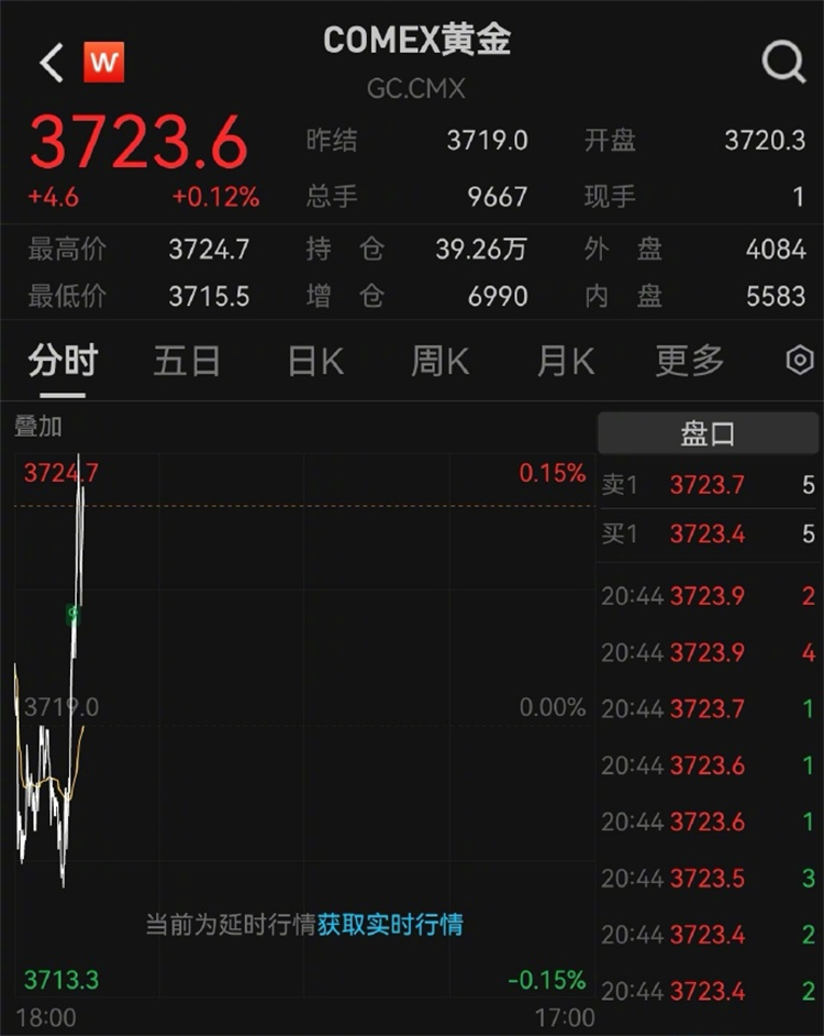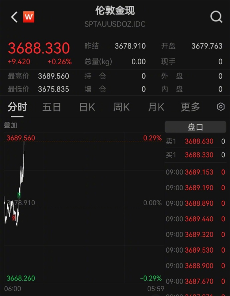 當(dāng)?shù)貢r(shí)間9月15日尾盤,倫敦現(xiàn)貨黃金突破3680美元關(guān)口。9月16日亞洲早盤,黃金延續(xù)上漲勢(shì)頭,截至9時(shí),倫敦現(xiàn)貨黃金最高觸及3689.56美元/盎司,最高漲幅0.29%,創(chuàng)下歷史新高;COMEX黃金最高觸及3724.7美元/盎司,最高漲幅0.15%。