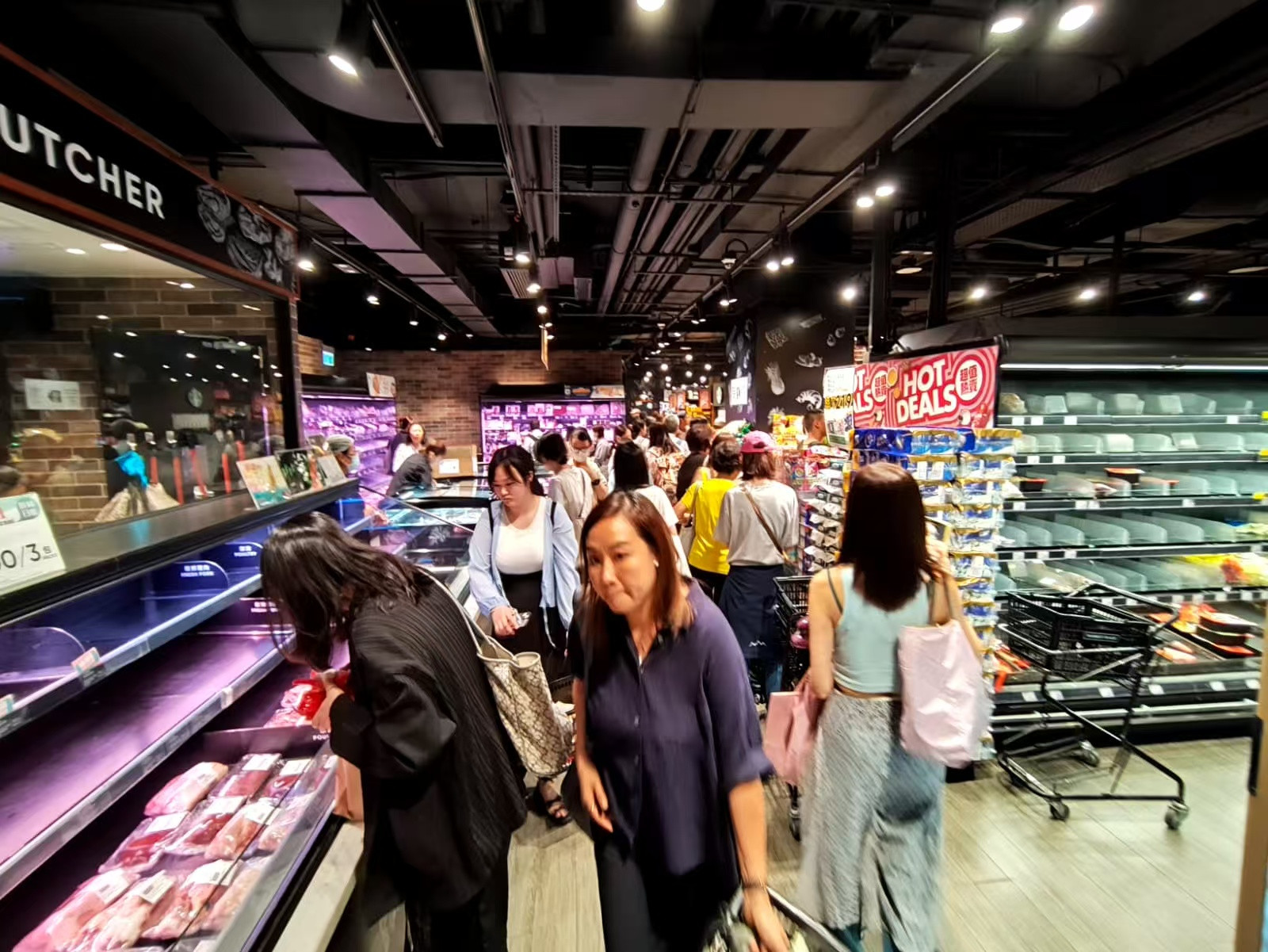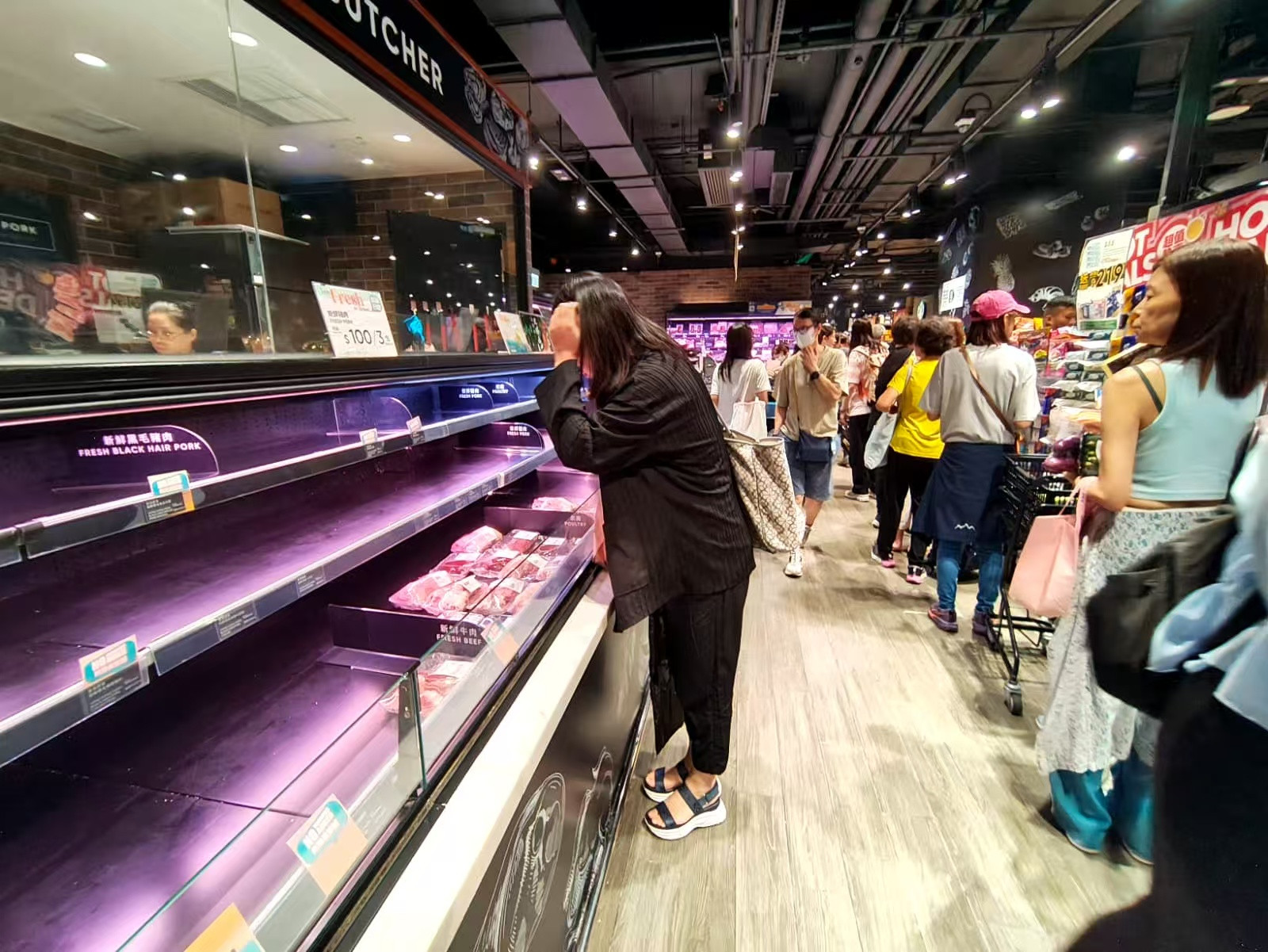 於老人院工作的伍小姐稱買唔到菜,只買了鴨、蕃薯、雞蛋,價格不是昂貴,回家會關(guān)好門窗。(圖為九龍灣超市 馮瀚文攝)