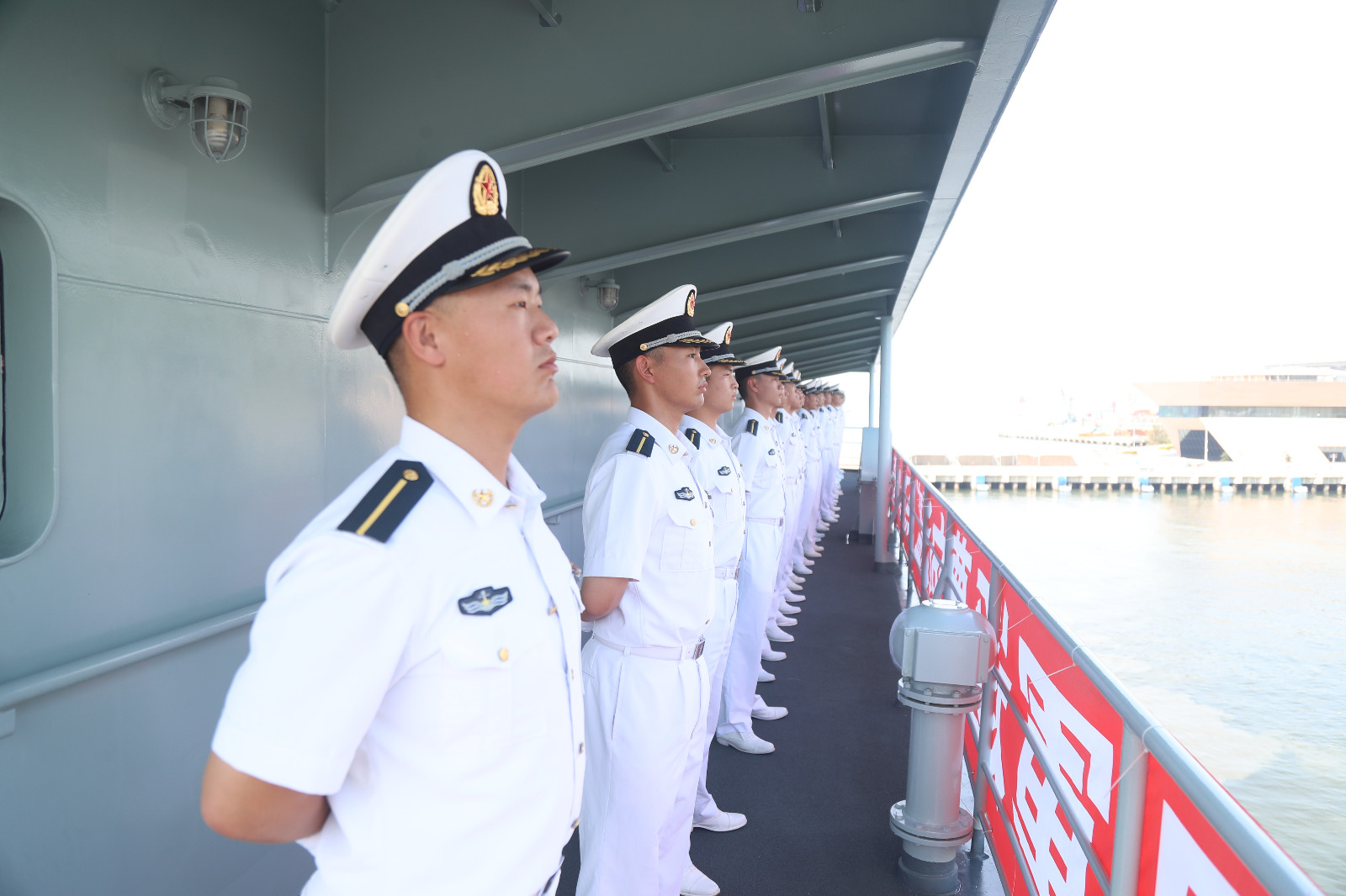 10時(shí)許,戚繼光艦放下舷梯,在熱烈的軍樂聲中,編隊(duì)領(lǐng)導(dǎo)及官兵、學(xué)員代表踏上昂船洲軍營(yíng)碼頭,與駐港部隊(duì)官兵代表親切握手、互致問候。駐香港部隊(duì)相關(guān)負(fù)責(zé)人和代表出席儀式。