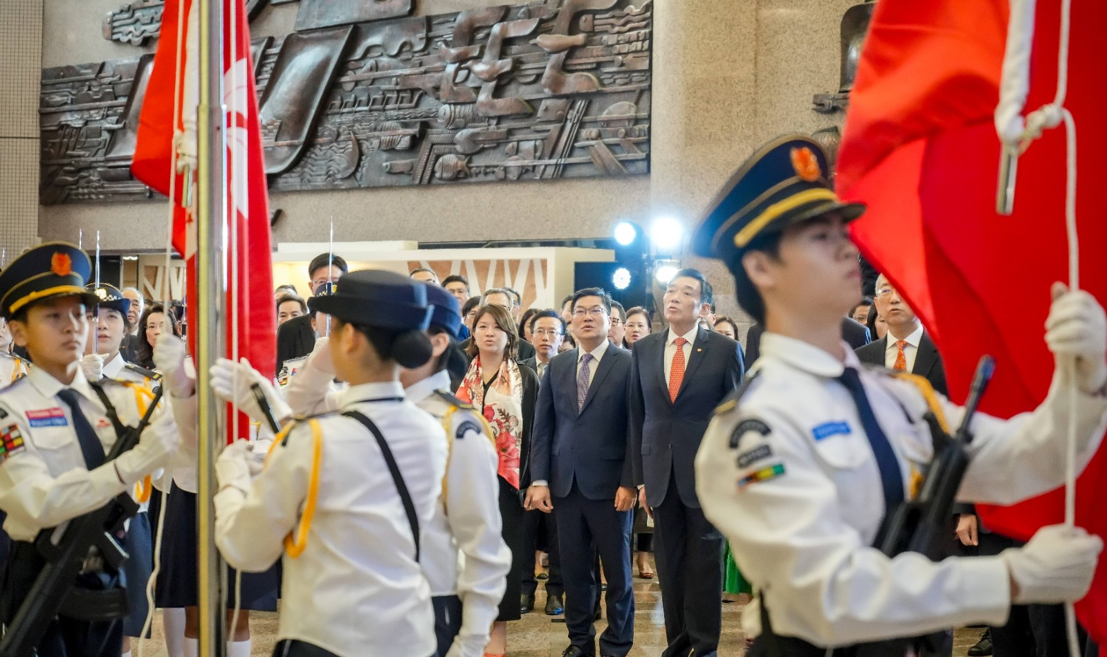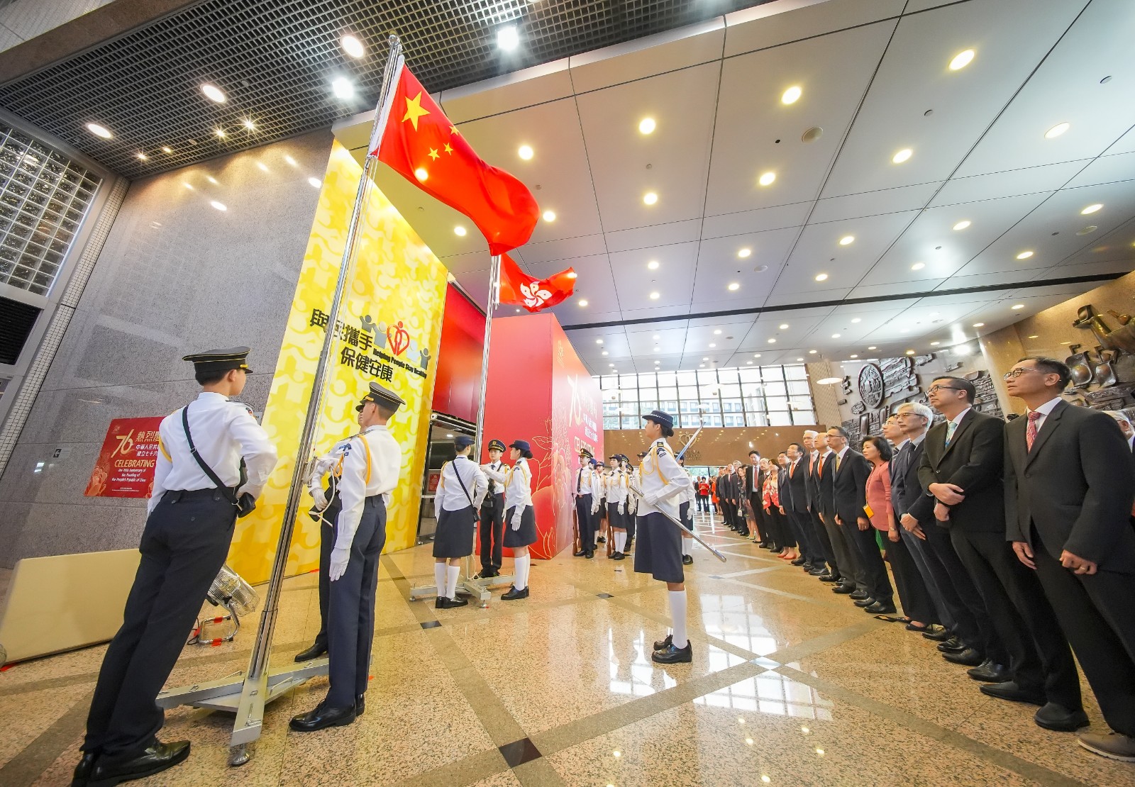 醫(yī)院管理局(醫(yī)管局)今日(10月1日)10時30分在醫(yī)院管理局大樓舉行升旗儀式,慶祝中華人民共和國成立76周年。國旗和區(qū)旗在奏唱國歌聲中徐徐升起,與會者都祝願國家繁榮安定,國泰民安。