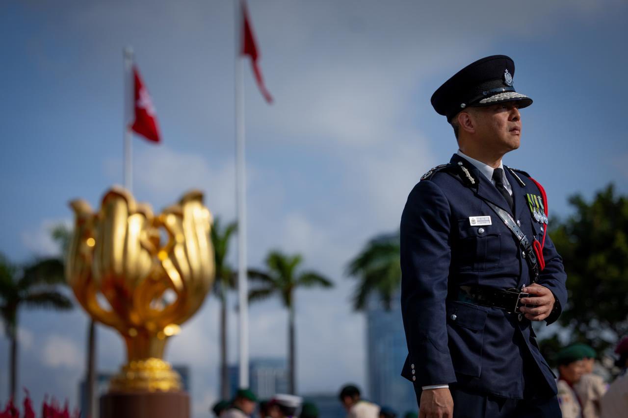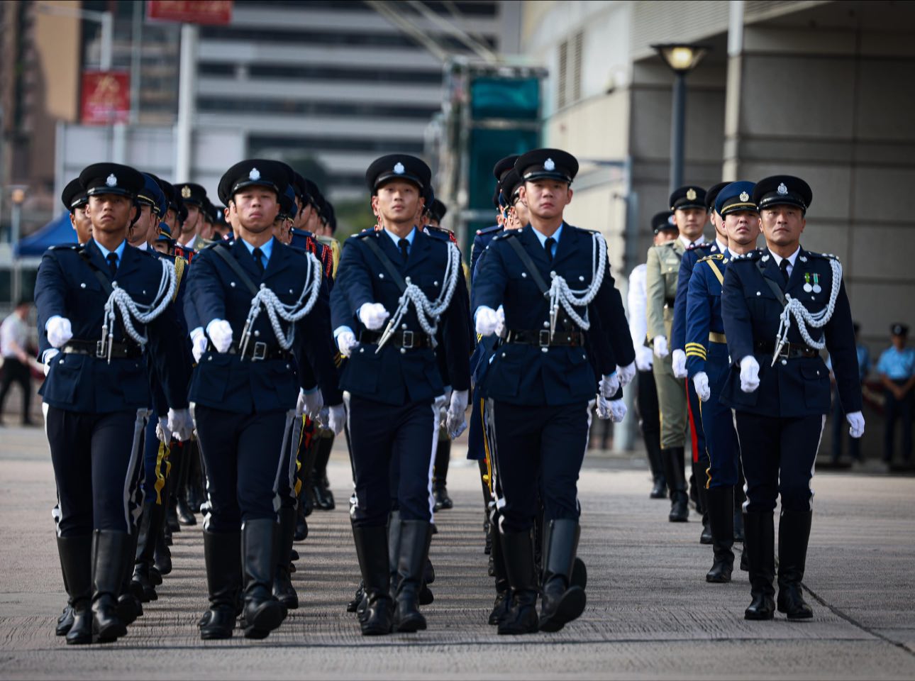 升旗儀式過後,護旗方隊步伐齊整離開會場。警務(wù)處處長周一鳴亦在場觀禮,並與少年制服團隊隊員合照留念。(記者 區(qū)天海)