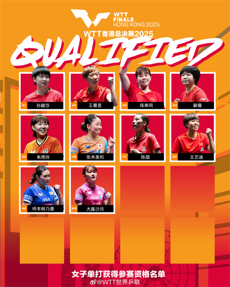 WTT世界乒聯(lián)今日(10月7日)下午發(fā)布目前獲得WTT香港總決賽2025參賽資格的名單,國乒多人獲香港總決賽參賽資格。(圖源 微博@WTT世界乒聯(lián))