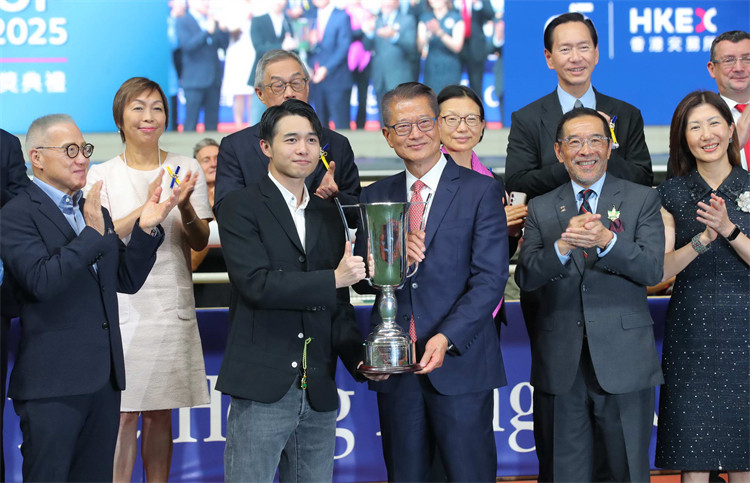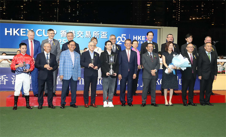 「爆笑」馬主正是已故賭王何鴻燊之子何猷亨,財政司司長陳茂波大駕光臨出席頒獎儀式,何猷亨從財爺手上接過香港交易所盃。(影片來自香港賽馬會)